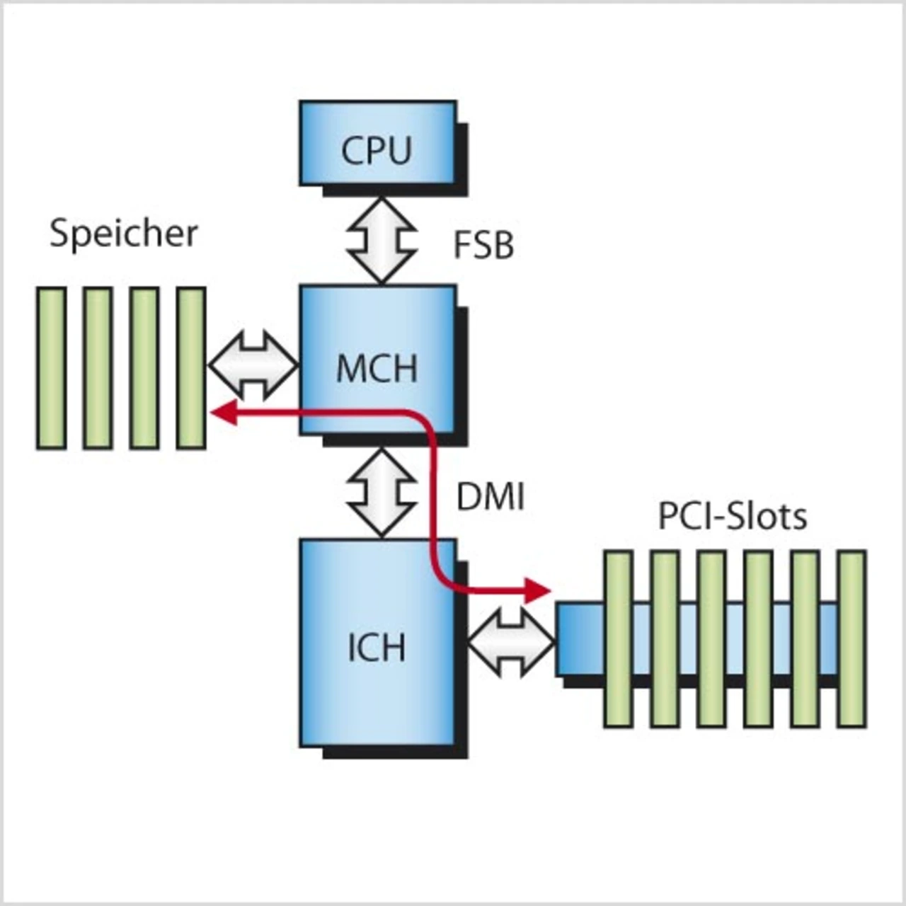 Um DMA zu verwenden, muss der Controller auf dem PCI-Target zunächst mit den Transfer-Parametern konfiguriert werden (Quelladresse, Zieladresse, Anzahl der zu übertragenden Bytes usw.). Anschließend fordert der DMA-Controller die Kontrolle über den PCI-Bus an und leitet die Übertragung ein, sobald der Zugriff gewährt wird. Um Daten vom Hauptspeicher zum PCI-Target zu übertragen, startet der Controller dazu einen PCI-Lesezugriff, der vom ICH an den MCH und weiter an das Direct Media Interface geleitet wird. Der MCH liest direkt vom Hauptspeicher und liefert die Daten über den ICH zurück an das PCI-Target.