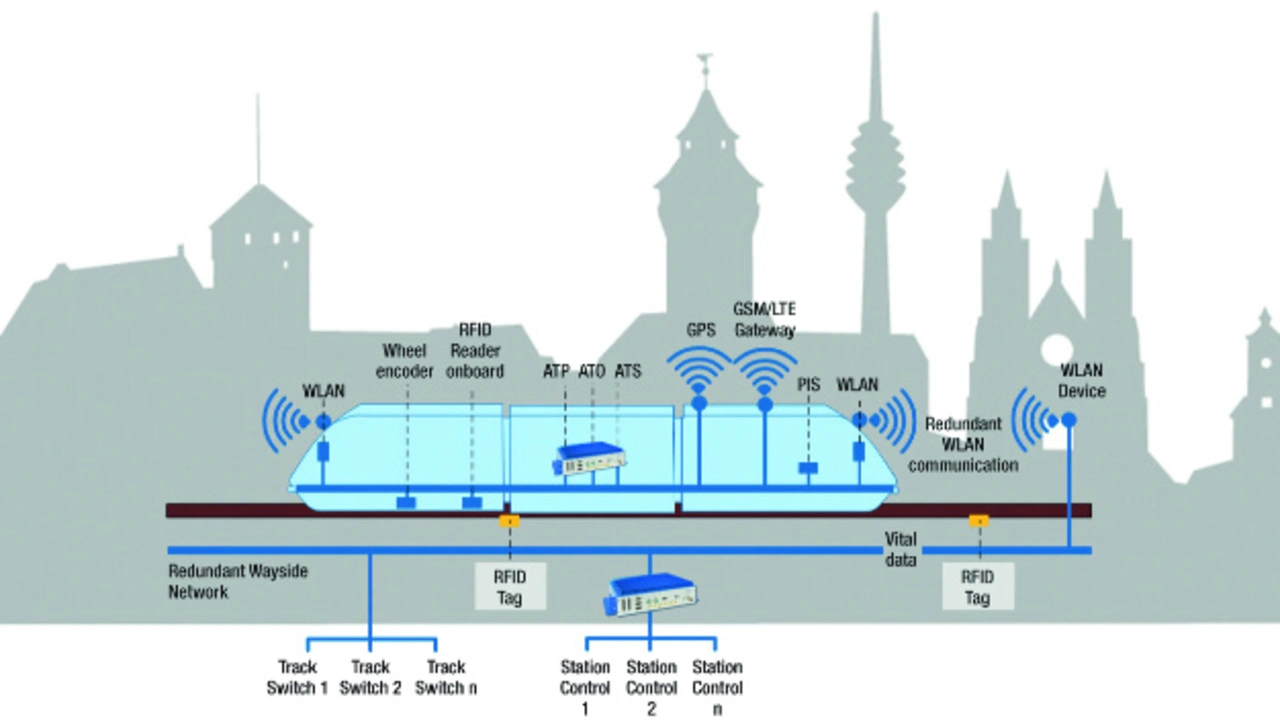 Die typische Architektur eines modernen CBTC-Systems ist in Bild 1 dargestellt und umfasst unter anderem sogenannte Wegeausrüstung, zu der das Stellwerk und die Subsysteme gehören. Sie steuern jede Zone im Netzwerk, in der Regel mit den Funktionen ATP und ATO am Streckenverlauf, und je nach Anbieter zentralisiert oder verteilt. Die Steuerung des Systems erfolgt über den zentralen Befehl ATS, lokale Steuerungssubsysteme können jedoch ebenso als Notfalllösung einbezogen werden. Ein weiterer Bestandteil ist das funkbasierte Zug-zum-Weg-Kommunikations-Subsystem.