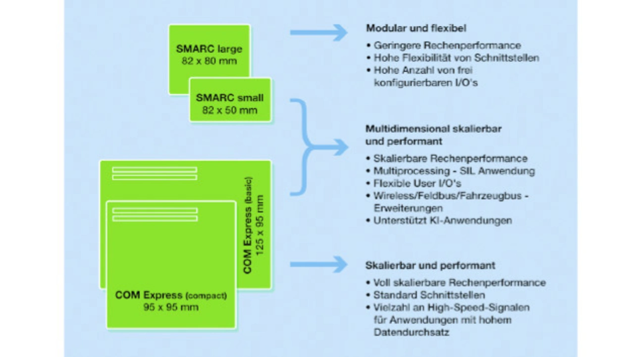 Die Plattform deckt eine große Leistungsbandbreite ab. So ist es möglich, für weniger performante Anwendungen SMARC-Module zu verwenden. Der Ausbau mit lediglich einem COM-Express-Modul schließt dort an, wo SMARC endet und erweitert den Leistungsbereich bis in den Server-Chip-Bereich. Entsprechend bietet der Maximalausbau mit SMARC und COM Express den Kunden unter anderem Mehr-Prozessor-Anwendungen, nahezu unbegrenzt frei wählbare I/O-Schnittstellen und die Möglichkeit, das immer wichtigere Thema KI abzudecken (Bild 3).