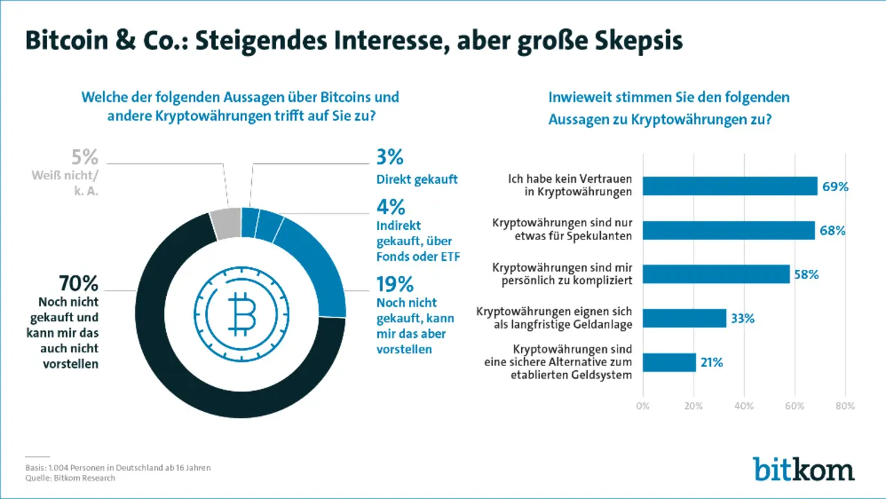 »Die letzten ein, zwei Jahre waren geprägt vom Institutionalisieren und Regulieren des Krypto-Marktes. Bei der Mehrheit der Privatinvestoren in Deutschland hat das bisher nicht zu einem Vertrauensschub geführt«, sagt Patrick Hansen, Bereichsleiter Blockchain beim Bitkom. »Diejenigen, die investieren, tun das insbesondere zur langfristigen Geldanlage und nicht in erster Linie um Kryptowährungen als Zahlungsmittel zu nutzen«. Kryptowährungen würden hierbei – ähnlich wie zum Beispiel Gold – als alternative Anlage genutzt.