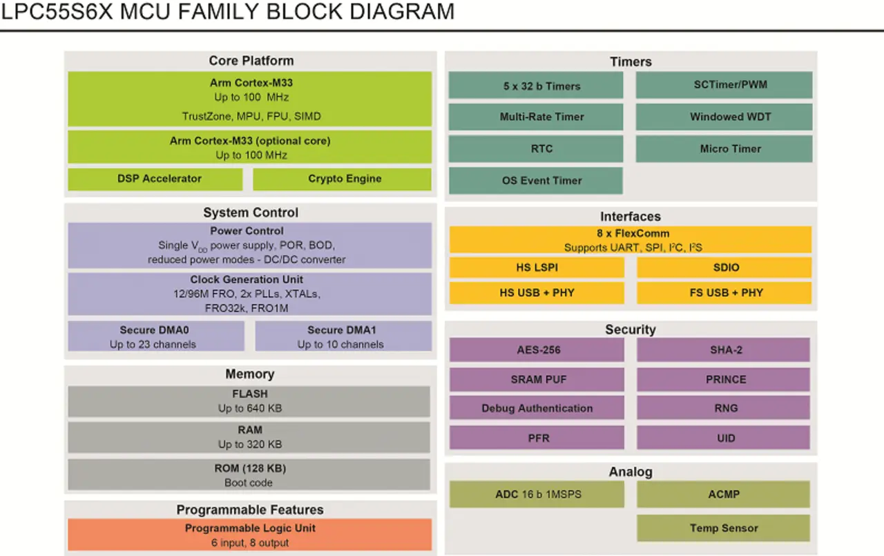 Der kürzlich veröffentlichte LPC55S6x von NXP integriert viele der oben beschriebenen hardwarebasierten Sicherheitsmerkmale und ist damit einzigartig auf dem MCU-Markt. Er verfügt über zwei Arm-Cortex-M33-Kerne, von denen einer TrustZone-M unterstützt, sowie mehrere Co-Prozessoren.