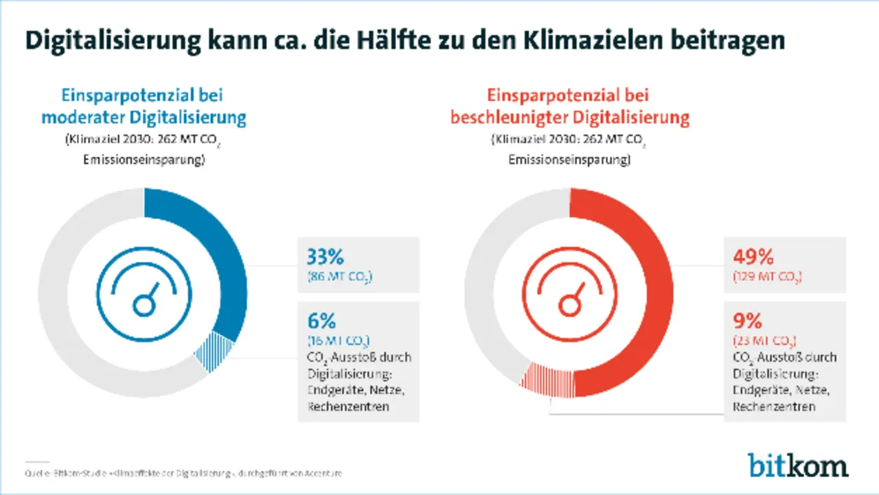 So zeigt zum Beispiel die Bitkom-Studie »Klimaeffekte der Digitalisierung«, dass Deutschland mit einem beschleunigten Einsatz digitaler Technologien einen großen Teil der nötigen CO2-Einsparungen erreichen kann. Große Potenziale gibt es unter anderem in den Bereichen Industrie, Mobilität und Gebäude.