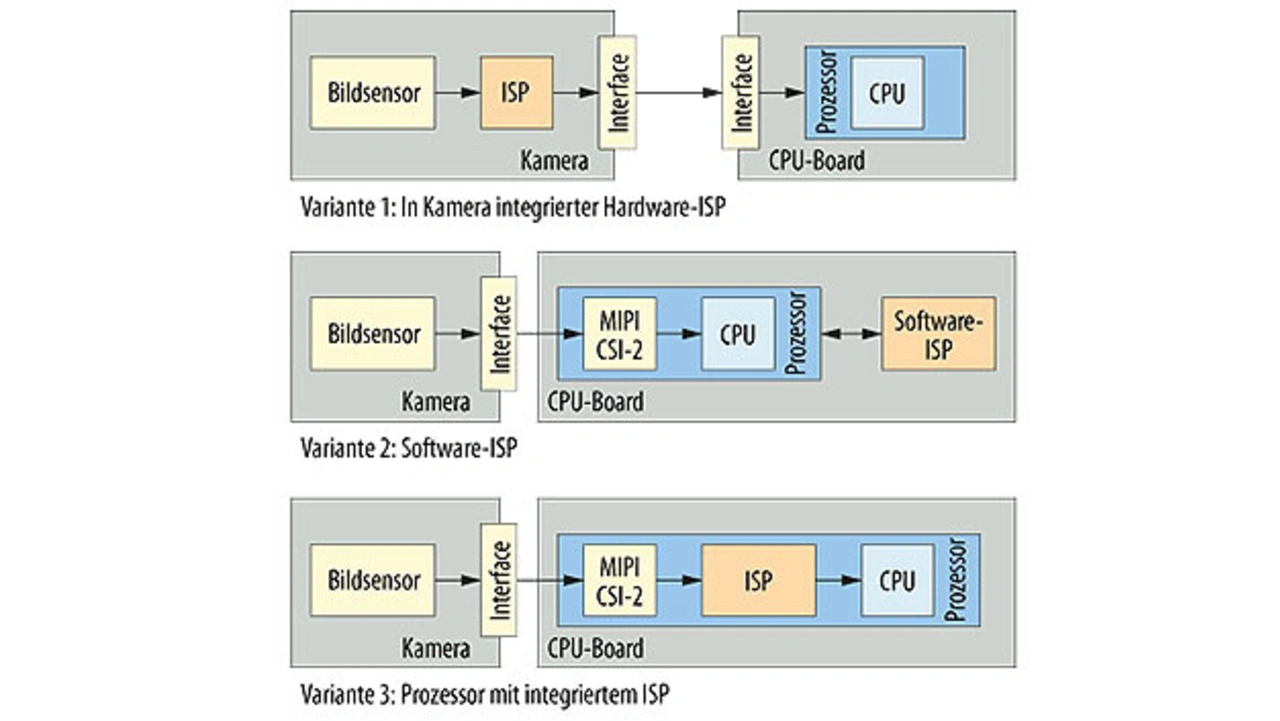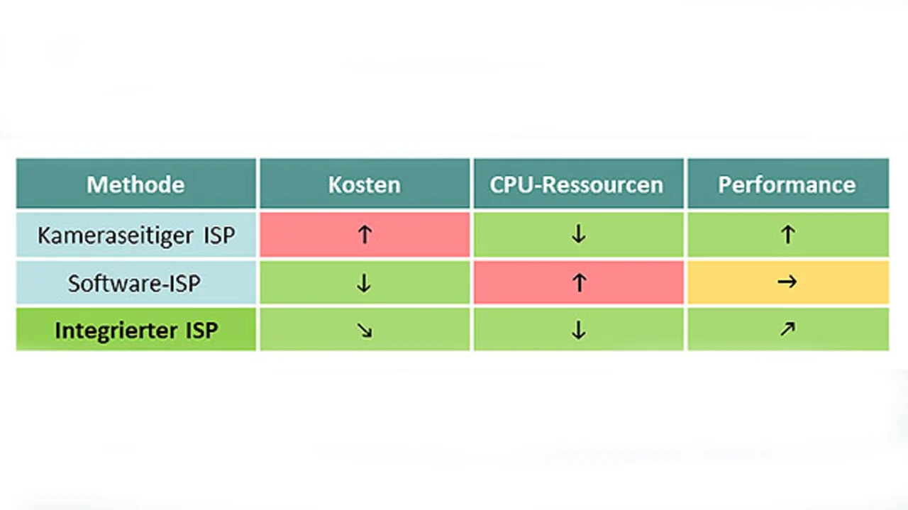 Moderne Arm-Prozessoren wie beispielsweise der i.MX 8M Plus von NXP eröffnen eine dritte Möglichkeit: Sie haben bereits Image-Signal-Prozessoren chipseitig integriert. Bildrohdaten von einem CMOS-Sensor mit MIPI-CSI-2-Schnittstelle lassen sich unabhängig von den Ressourcen des Anwendungsprozessors vorverarbeiten. Diese Lösung erreicht die Performance von separaten ISPs bei geringeren Kosten. Die Tabelle zeigt die Optionen im Vergleich.