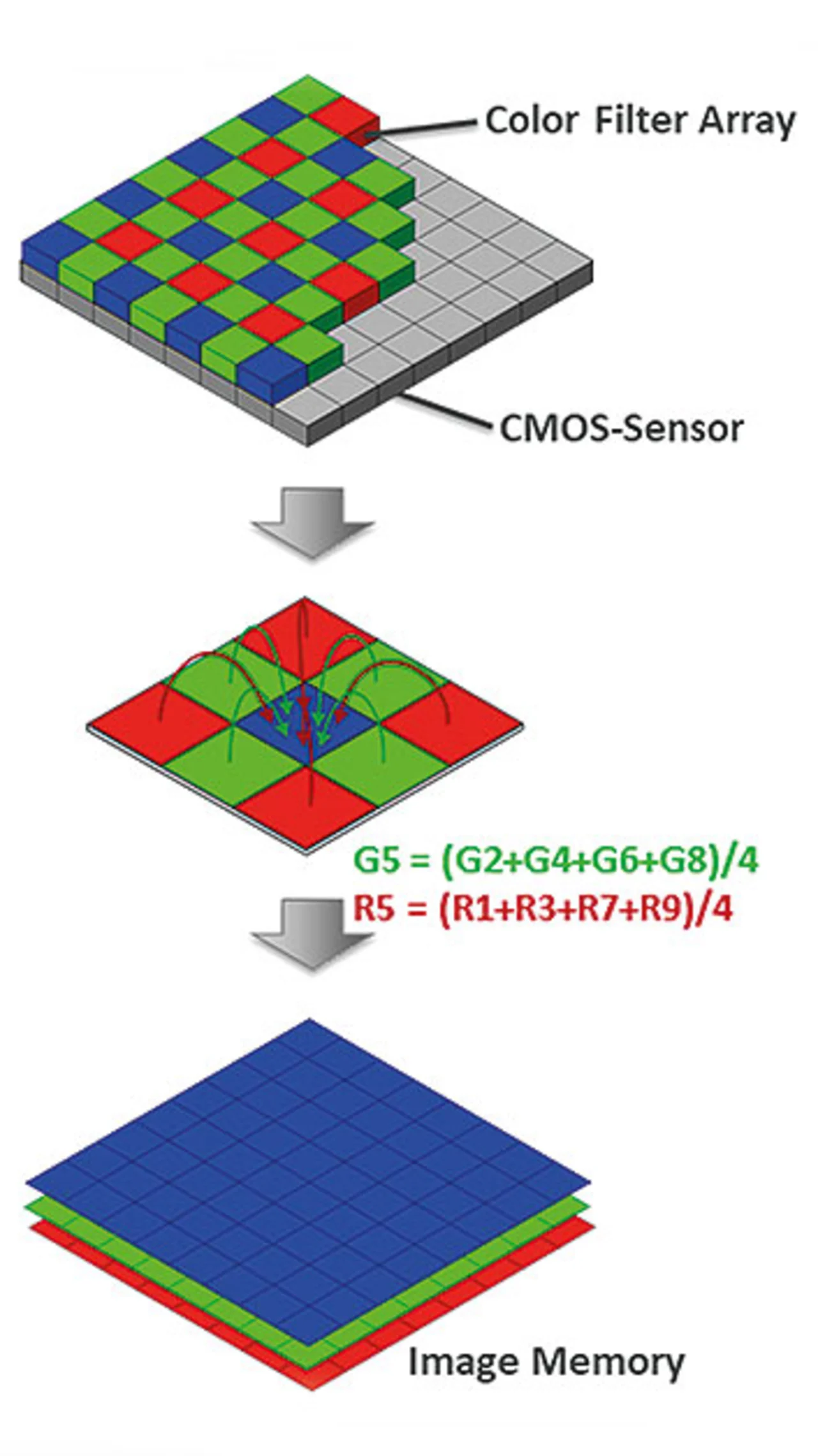 Die Pixel sind dabei zeilenweise abwechselnd mit roten und grünen bzw. grünen und blauen Farbfiltern abgedeckt. Jedes Pixel liefert also nur einen Farbauszug. Der höhere Anteil an grünen Pixeln geht auf eine Adaption an die Wahrnehmung des menschlichen Auges zurück. Zur Vervollständigung des RGB-Tripels müssen die Farbauszüge der benachbarten Pixel herangezogen werden. Im Bild ist ein (sehr einfaches) Verfahren skizziert, das die fehlenden Farbwerte aus den Mittelwerten der benachbarten Pixel bestimmt. Daneben gibt es eine Reihe weiterer Algorithmen für die Bayer-Konvertierung. Bei der Planung eines Vision-Systems mit einem Einchip-Farbsensor ist aufgrund des Debayerings (auch Demosaicing) eine etwas höhere räumliche Unschärfe zu berücksichtigen.