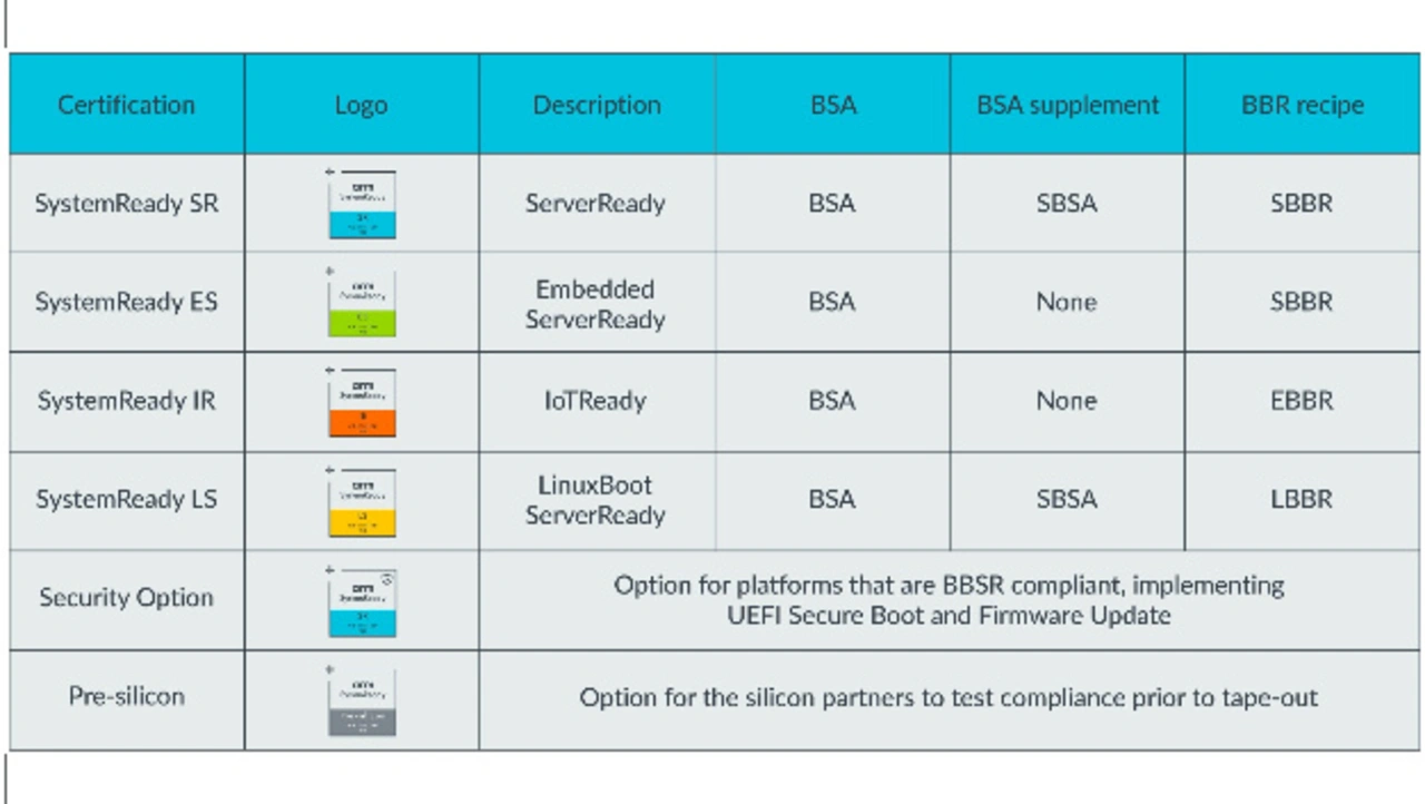 Anfänglich unterstützen diese neuen Spezifikationen vier Hauptgruppen von SystemReady sowie zwei weitere optionale Komponenten, die Sicherheitsoption und die Pre-Silizium-Zertifizierung.