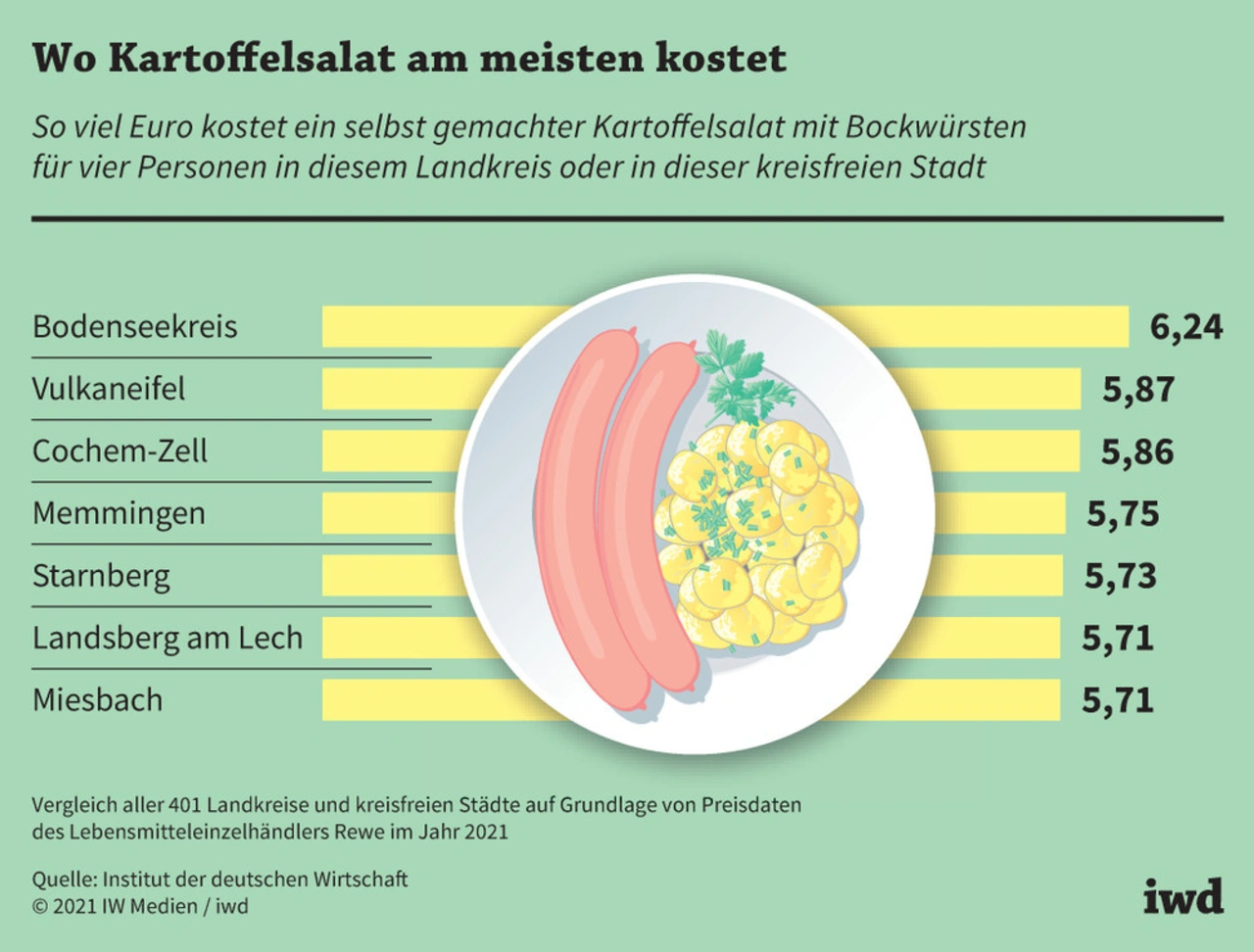 Den Preis für Kartoffelsalat mit Bockwürsten hat das Institut der deutschen Wirtschaft (IW) mithilfe regionaler Daten des Lebensmittelhändlers Rewe für alle 401 Landkreise und kreisfreien Städte Deutschlands berechnet. Das Ergebnis: Der Preisunterschied zwischen verschiedenen Regionen für einen selbst gemachten Kartoffelsalat für vier Personen mit Bockwürsten liegt bei bis zu 25 Prozent.