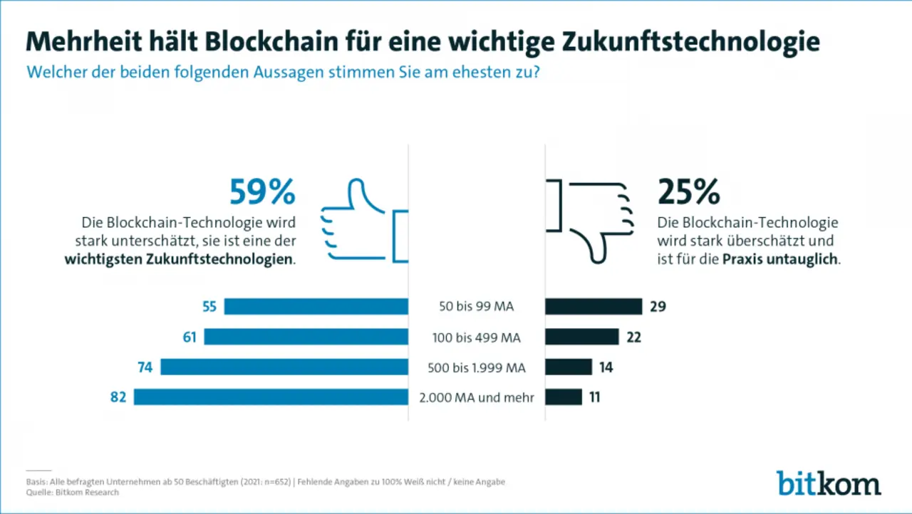 Umgekehrt meinen lediglich 25 % aller Unternehmen, die Blockchain-Technologie werde überschätzt und sei für die Praxis untauglich. Jedoch gaben lediglich 43 Prozent der Unternehmen an, sich mit der Blockchain-Technologie beschäftigt zu haben – und nur jedes Vierte sagt, dass man dem Thema Blockchain interessiert und aufgeschlossen gegenübersteht.