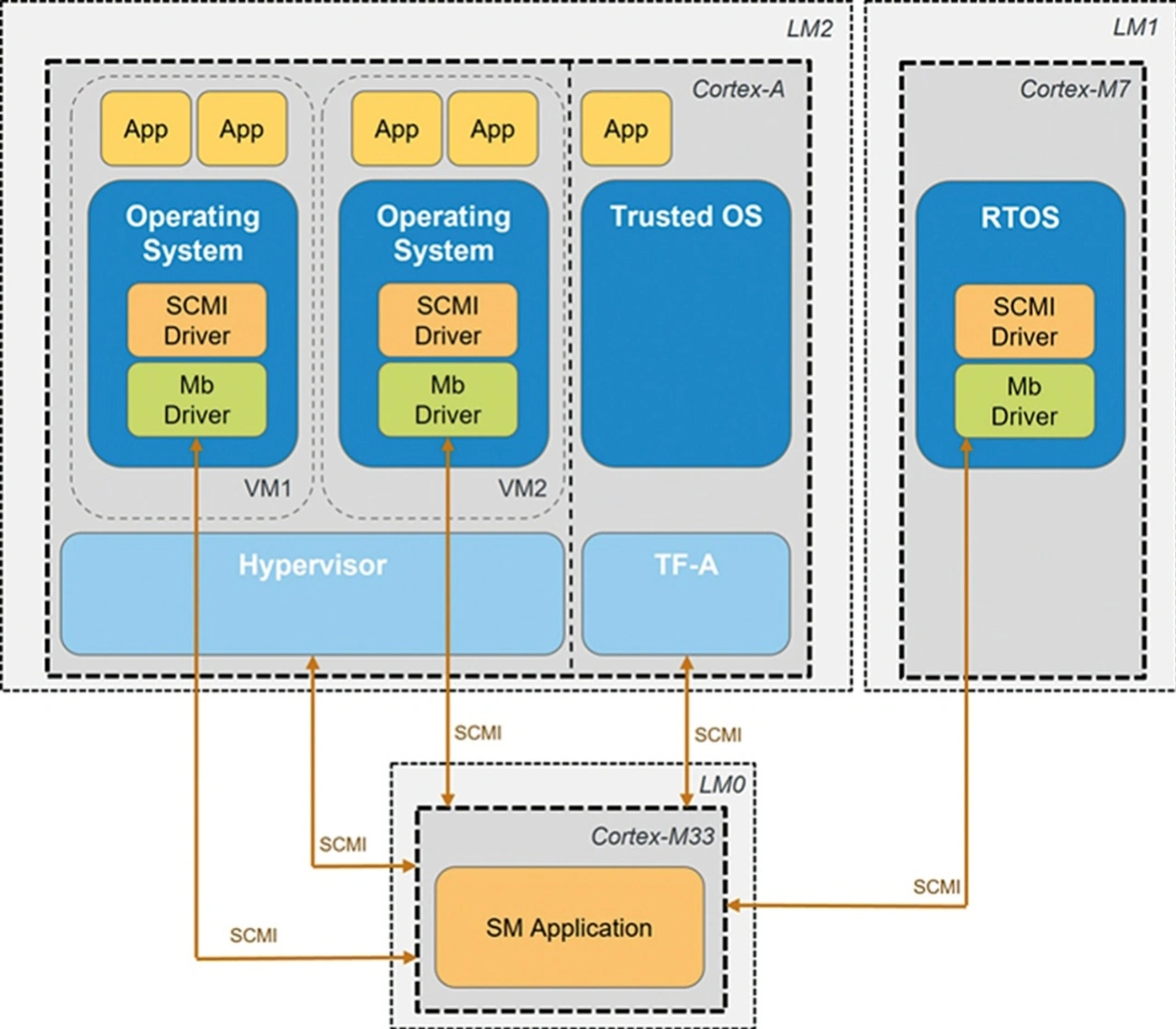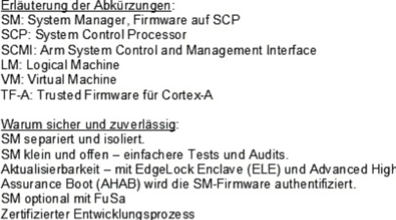 Der Wechsel zwischen diesen beiden Umgebungen, die als sicherer Monitor (Cortex-A Core) bzw. als Kernlogik (Cortex-M Core) bezeichnet werden, erfolgt per Software. Die beiden CPU-Architekturen bieten ähnliche Sicherheitskonzepte, aber mit einer völlig anderen Implementierung. Das Konzept der sicheren und nicht sicheren Umgebungen geht über den Prozessor hinaus, um Speicher, Software, Schnittstellen, Bussysteme, Interrupts und Peripherie innerhalb eines Embedded-Moduls zu schützen.