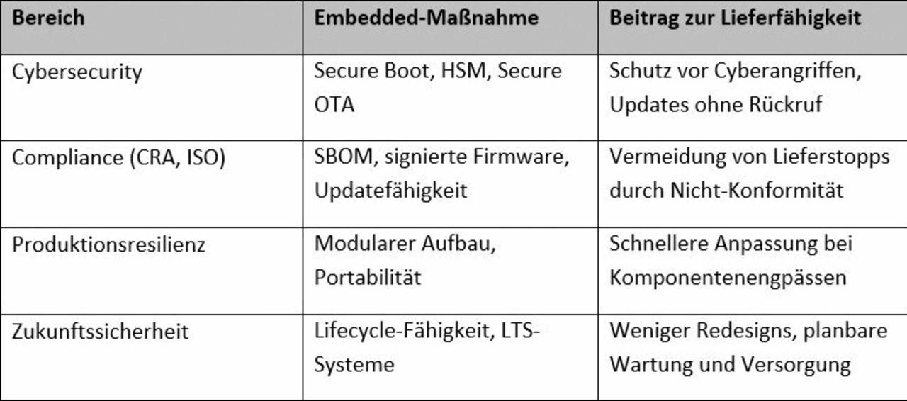 Für 2026 gibt es bei Embedded-Systemen in puncto Sicherheit (im umfassenden Sinn: Safety, Security und Supply Chain Stability) mehrere zentrale Herausforderungen und Entwicklungen zu beachten. Zunehmende Bedrohungen und neue Regularien, wie der Cyber Resilience Act (CRA), können einen direkten und signifikanten Einfluss auf die Lieferfähigkeit von Geräten und Systemen ausüben. Das betrifft Hersteller und Zulieferer über die gesamte Wertschöpfungskette hinweg. Die Architektur, Firmware, Sicherheitsfunktionen und Lifecycle-Fähigkeiten eines Embedded-Systems können maßgeblich dazu beitragen, sich gegen Bedrohungen zu schützen und gleichzeitig die Einhaltung von Regularien sicherzustellen, um eine stabile Lieferkette zu gewährleisten.