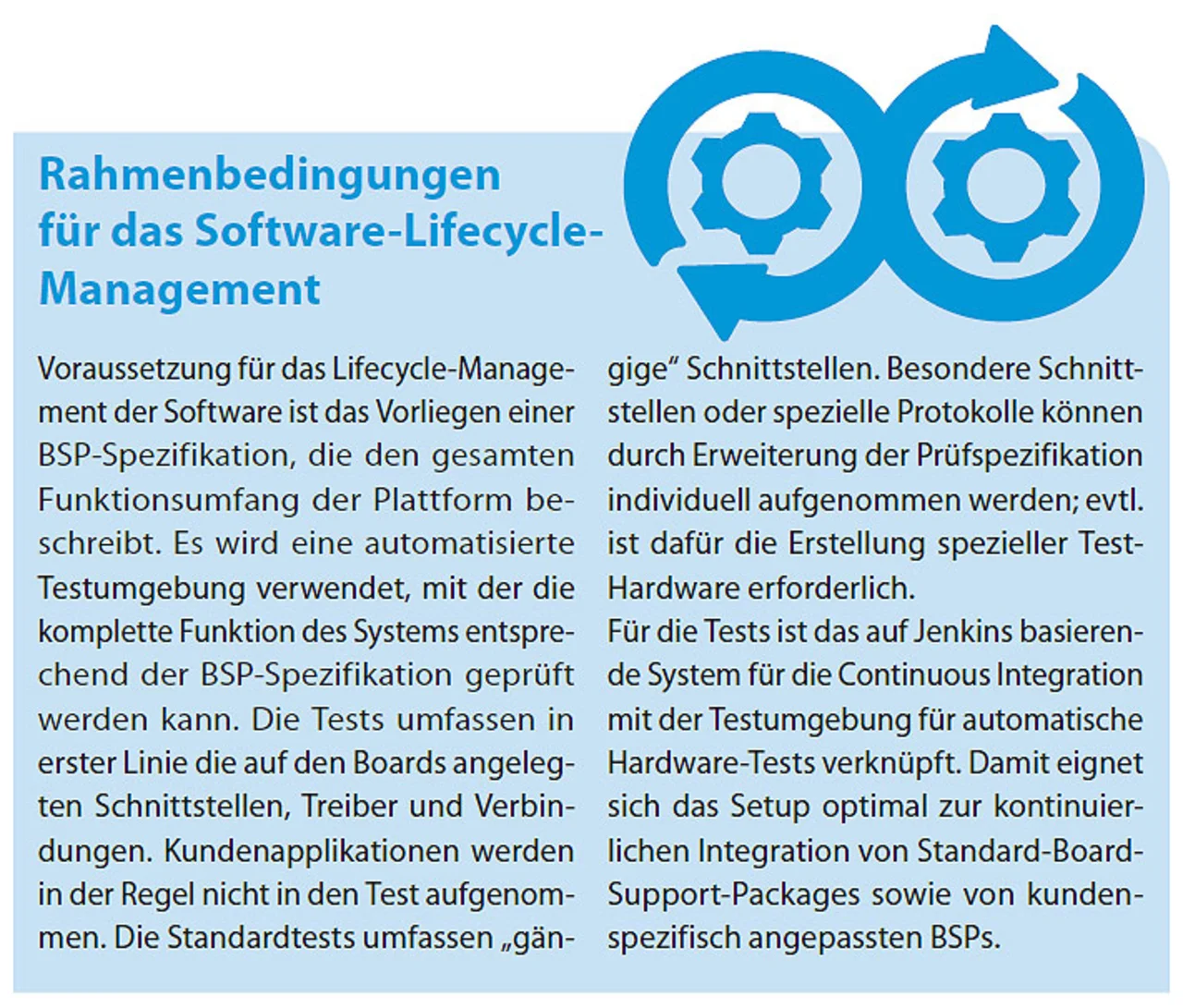 Außerdem werden kontinuierlich Security- und Bugfixes eingespielt. In der Testfarm wird die Hardware mit automatischen Nightly-Builds getestet, sodass etwaige Konflikte schnell erkannt und zeitnah behoben werden können. Gleichzeitig wird die Übereinstimmung der BSPs mit den BSP-Spezifikationen in der Testfarm kontinuierlich überprüft. Sämtliche Resultate werden in Testprotokollen festgehalten.