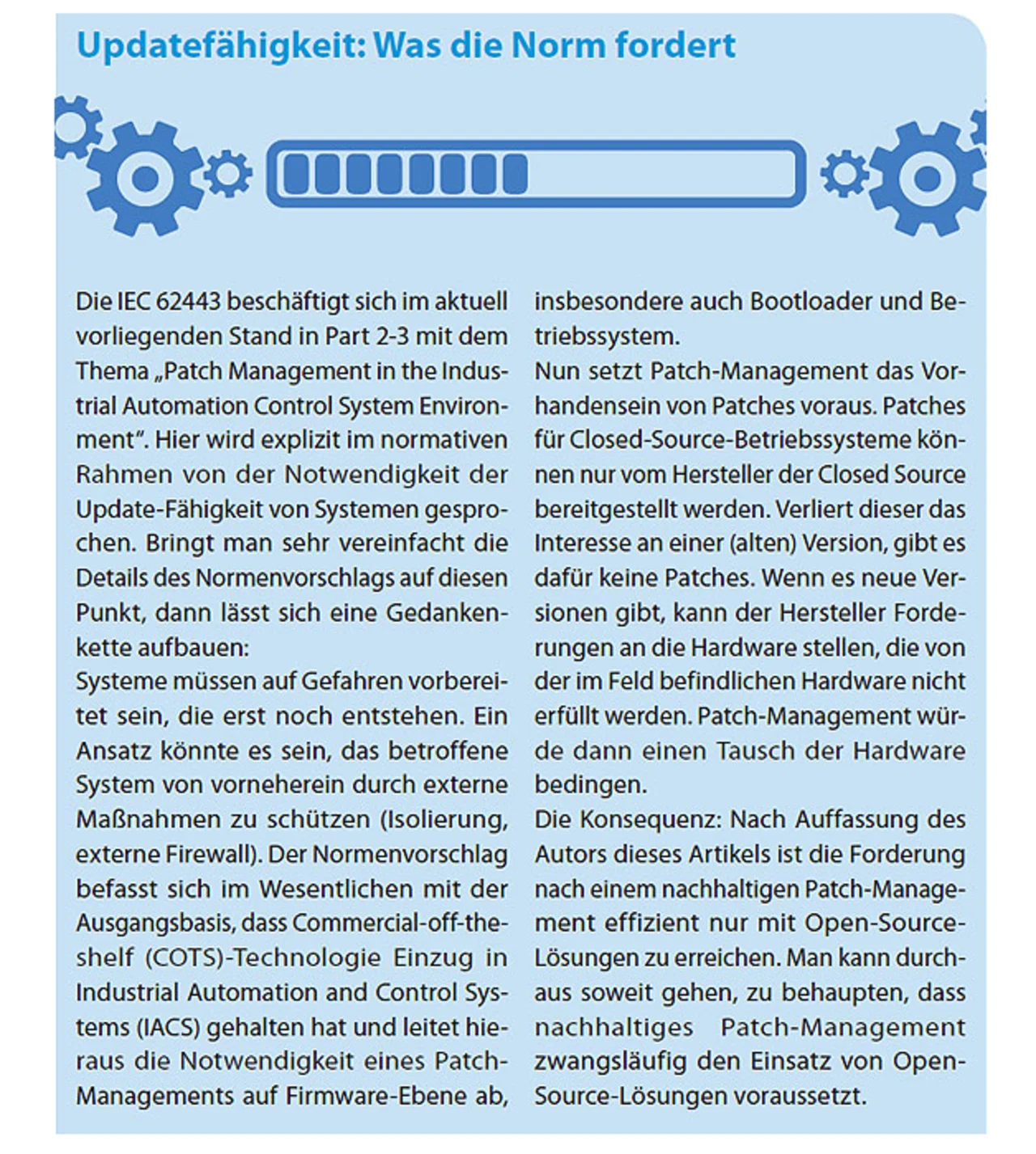 In einer vernetzten Welt müssen industrielle Systeme mit immer neu entstehenden Sicherheitsherausforderungen schritthalten können. Wer ein Sicherheitsleck nicht schließen kann, hat verloren. Open Source und Mainline schaffen die Basis, Systeme im Feld aktuell halten zu können. Die Reaktionszeit zwischen Bekanntwerden einer Gefahr und dem Ausrollen eines Updates im Feld muss so kurz wie bleiben. Software-Lifecycle-Management als ein kontinuierlicher Prozess ist der Schlüssel, Systeme im Feld aktuell zu halten und auf Gefahren in kürzester Zeit mit stabilen Fixes reagieren zu können.