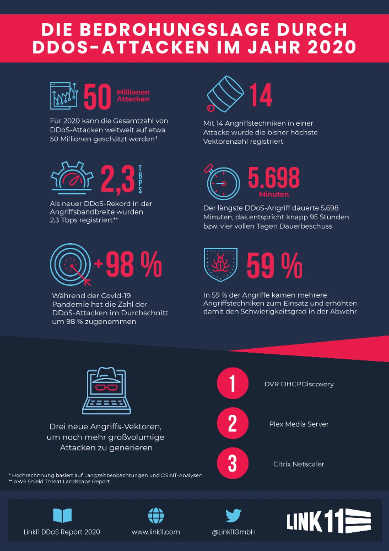 Die Auswertungen lassen einen Ausblick auf die Entwicklung bei DDoS-Attacken für 2021 zu. Mit zu den wichtigsten Trends gehören, dass die digitale Unternehmens-IT und speziell Cloud-Dienste und APIs in den kommenden Monaten weiterhin unter starkem DDoS-Beschuss stehen werden. Außerdem sollten Unternehmen die Gefahr durch DDoS-Erpressungen in ihre Risikobewertungen aufnehmen. Wie kaum eine andere Art von Cyber-Attacken können DDoS-Angriffe die digitalen Geschäftsprozesse schnell und langanhaltend zum Stillstand bringen. Detaillierte Informationen zur Bedrohungslage liefert der vollständige Link11 DDoS-Report. Er steht als Download auf der Link11-Webseite bereit.