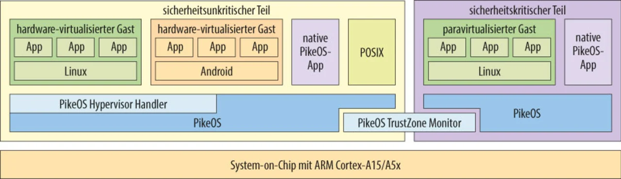 Version 4.0 von PikeOS enthält eigens Optimierungen für die QorIQ-Prozessoren von Freescale sowie für ARM Cortex-A9 und -A15. Nach wie vor läuft der Hypervisor aber auch auf anderen Prozessor-Architekturen wie PowerPC, x86, Mips und Sparc V8. Die QorIQ-Anpassung geschah im Auftrag von Freescale für nicht näher genannte Projekte im Bereich Automotive und Kommunikation. Von größerem allgemeinen Interesse dürften die Cortex-A9- und A15-Versionen sein, die vorwiegend in Automobil-Anwendungen zum Einsatz kommen. Hier stützt sich PikeOS auf die Funktionen der ARM Trustzone und – beim A15 – auf die dort vorhandenen Hardware-Virtualisierungsfunktionen.