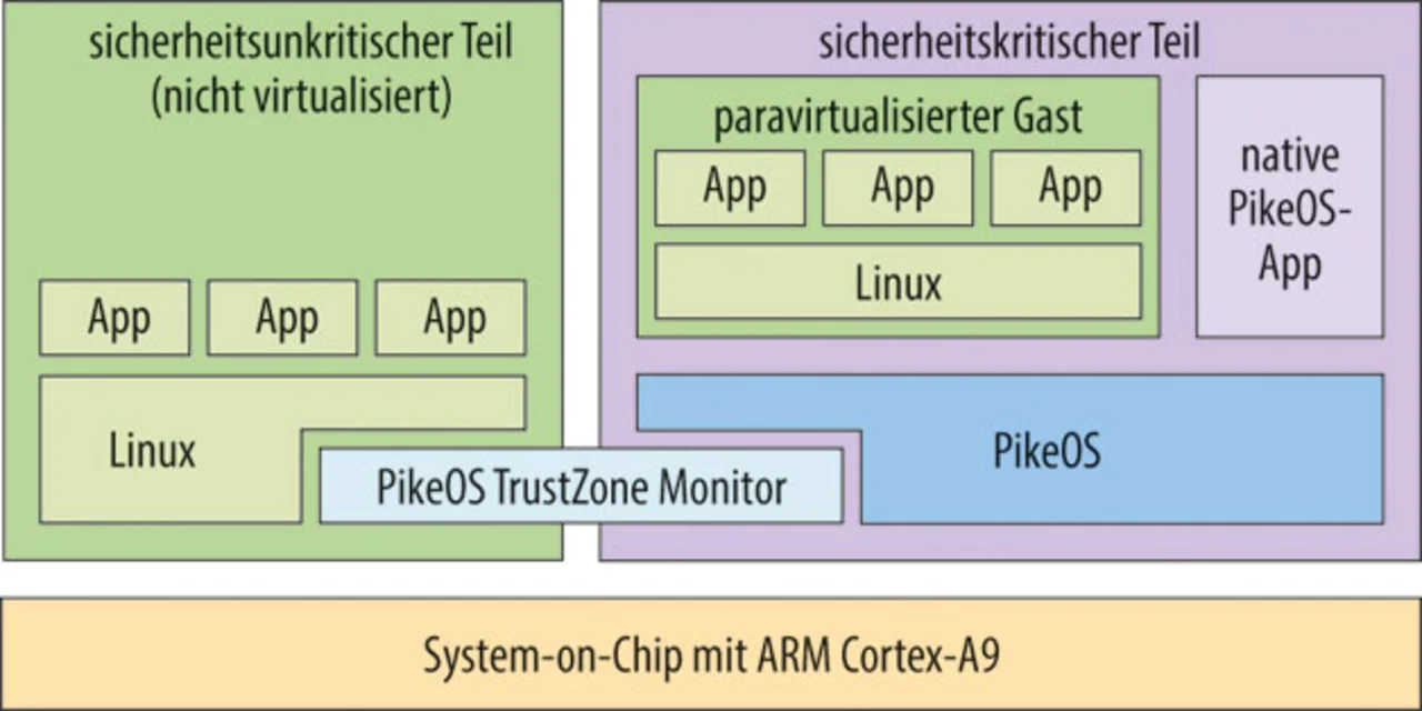 Im gesicherten Teil werden native PikeOS-Anwendungen betrieben sowie ebenfalls ein Linux-System. Die Gastsysteme im sicheren Teil sind paravirtualisiert. Das bedeutet, dass das Betriebssystem nur im User-Mode betrieben wird. Wenn Befehle auftauchen, die einen Wechsel in den Kernel-Mode erzwingen würden, muss dieser Wechsel abgefangen werden. Dazu ist eine Modifikation des Betriebssystems notwendig, zu der logischerweise der Quellcode vorliegen muss. Mit seiner Embedded-Distribution ELinOS kann Sysgo den Kunden hier ein paravirtualisiertes Linux bereitstellen.