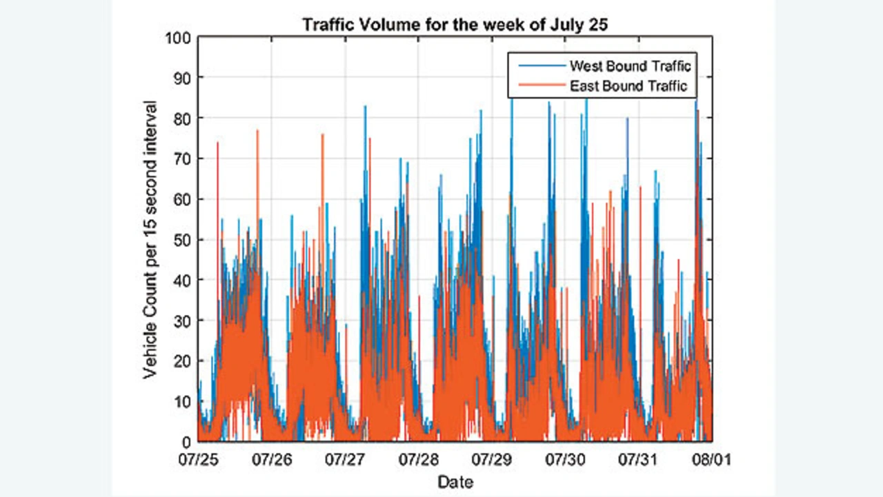 Als Nächstes werden die Daten grafisch dargestellt und beschriftet (Bild 5). Die täglichen Schwankungen des Verkehrsaufkommens sind deutlich zu sehen. Auch wenn dies an den Rohdaten schwerer zu erkennen ist, lässt sich am Wochenende (25.7. und 26.7.) ein anderes Muster beobachten als an den Wochentagen (27.7. bis 31.7.). An den Wochentagen gibt es morgens und nachmittags wegen des Berufsverkehrs höhere Spitzen.
