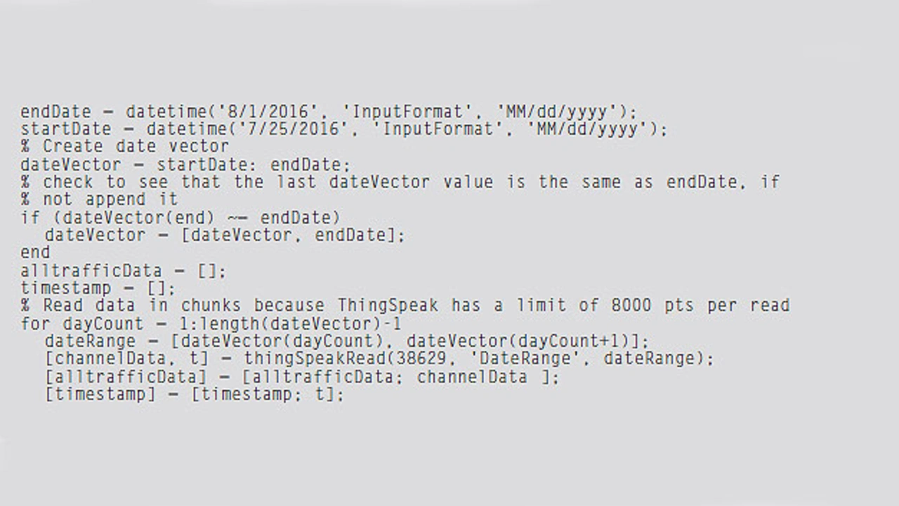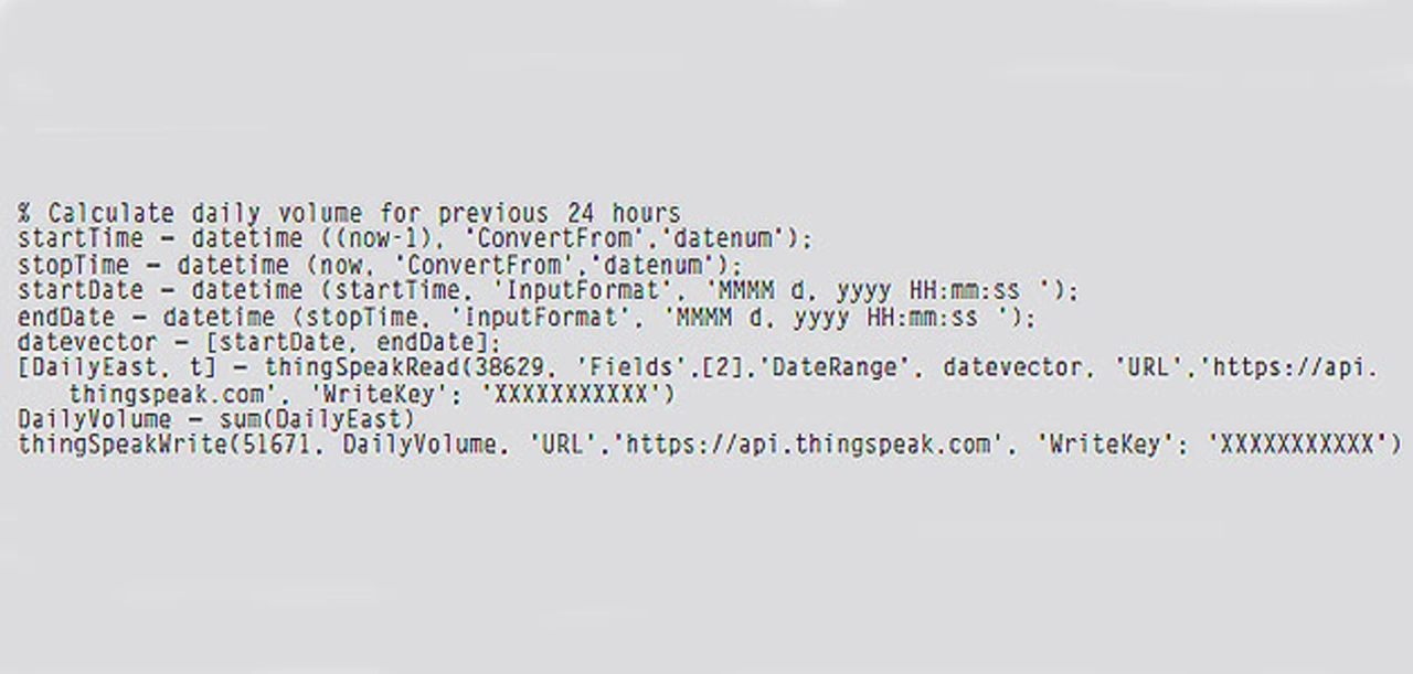 Um das Verkehrsaufkommen zu berechnen, kann die Analyse-App von Matlab, die über Thingspeak.com zur Verfügung steht, verwendet werden. Dazu ist etwas Code nötig, um die Verkehrs-Rohdaten des vorherigen Tages abzurufen und die Ergebnisse zusammenzufassen. Dann kommt der Befehl thingSpeakWrite zum Einsatz, um die Daten an den neuen Kanal „DailyVolume“ zu senden (Listing 2).