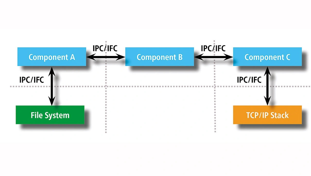 Natürlich würde das gesamte System aus mehreren Komponenten bestehen, die auf Kommunikationsmechanismen zwischen ihnen angewiesen sind, aber trotzdem wirken sich die Trennungs- und Ressourcenschutzmechanismen positiv auf die Sicherheit der Anwendung aus. Bild 2 beschreibt dazu klare Prozesstrennungsgrenzen und dedizierte Schnittstellen zwischen mehreren Komponenten, die eine vollständige Anwendung bilden.
