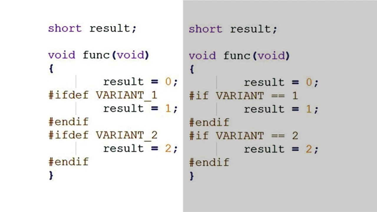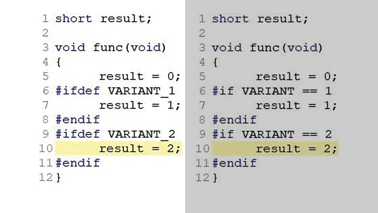 Falls die eingebettete Software in den Programmiersprachen C oder C++ geschrieben ist, wird oftmals der Präprozessor dieser Sprachen zur Erzeugung der Varianten herangezogen. Welche Variante erzeugt wird, kann davon abhängen, welche Präprozessorkonstante definiert ist (Bild 1, links) oder welchen Wert eine Präprozessorvariable hat (Bild 1, rechts).
