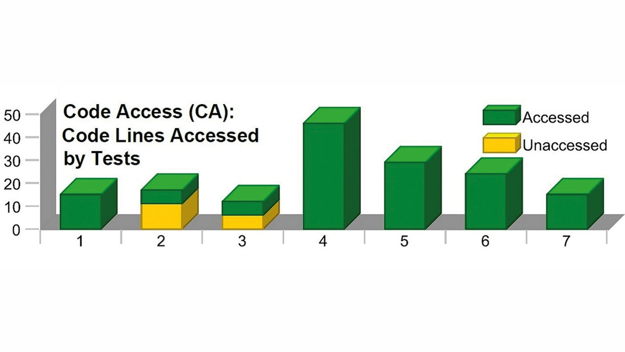Bild 3 zeigt die grafische Darstellung der Code-Access-Analyse in einem Testreport von TESSY. Die X-Achse zeigt die Quellcodemodule und die Y-Achse die Codezeilen. Natürlich gibt es im Testreport auch eine Tabelle mit den Quellcodenamen und der erreichten Code-Access-Prozentzahl.