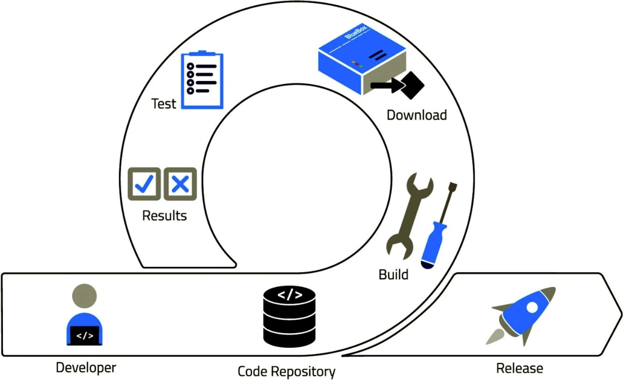 Ein typischer Anwendungsfall der flexiblen Schnittstellen zur Testautomatisierung ist Continuous Integration (CI, Bild 4). CI sieht vor, dass jedes Teammitglied, das gemeinsam mit anderen an einer Software arbeitet, seinen geänderten oder neu erstellten Code in kurzen Abständen in ein mit dem Team geteilten Repository integriert. Hierfür gibt es eine Reihe von geeigneten Continuous Integration Servern wie Jenkins, GitLab, TeamCity, CircleCI oder GitHub Actions. Mit der Integration löst man über eine CI-Software, die man inhouse oder in der Cloud hostet, eine schnelle und automatisierte Reihe von Schritten – eine sogenannte Pipeline – aus. Sie umfasst in der Regel den Build, statische Analysen sowie Unit- und Systemtests.