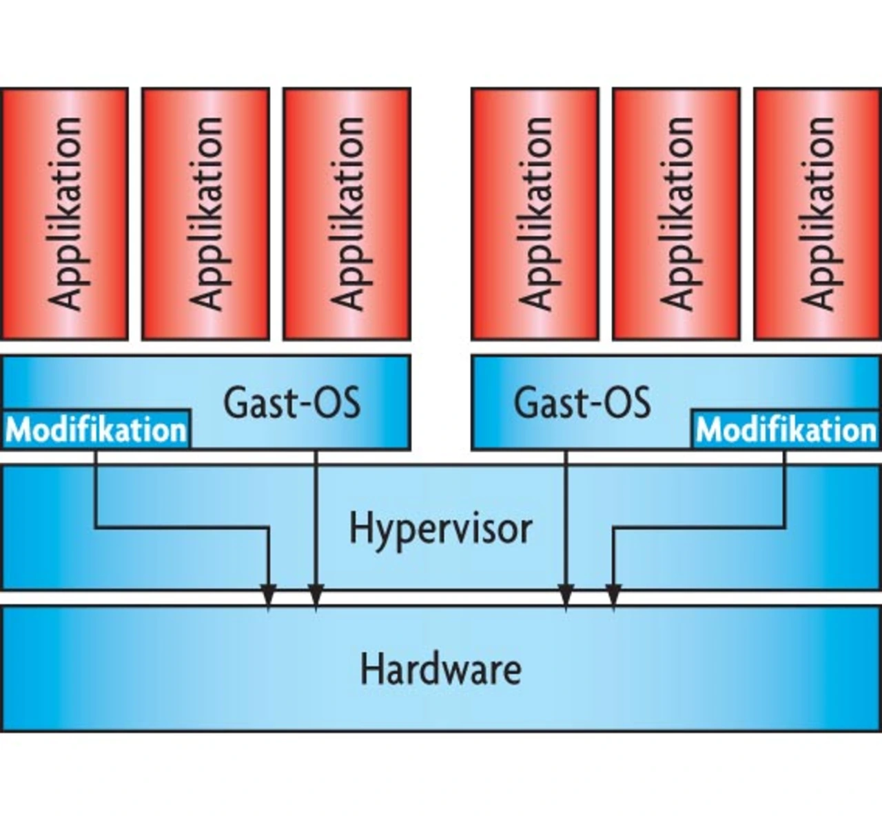 Bei der Paravirtualisierung wird das Betriebssystem so modifiziert, dass es im »user mode« ablaufen kann. Kritische Befehle, die nur im »Kernel mode« ausgeführt werden können, fängt nicht der Hypervisor ab, sondern das Betriebssystem selbst. Dadurch vereinfacht sich die Entwicklung des Hypervisors. Neben dieser Vereinfachung liegt der Vorteil der Paravirtualisierung in einer sehr performanten Abarbeitung der virtuellen Maschinen.