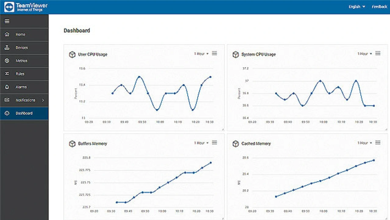 Weiterhin können auch Monitoring-Daten über die TeamViewer-Cloud visualisiert werden (Bild 2). »Out of the box« umfasst dies die individuellen Gerätedaten, wie CPU-Auslastung und freier/verwendeter Speicher. Es ist außerdem möglich, die über Ein- und Ausgänge des sysWORXX CTR-700 angebundenen Sensoren und Aktoren anzubinden und deren Informationen ebenfalls über die TeamViewer-IoT-Cloud zu visualisieren. Dadurch bietet TeamViewer eine simple Möglichkeit, ein leichtgewichtiges Prozessleitsystem zu realisieren.