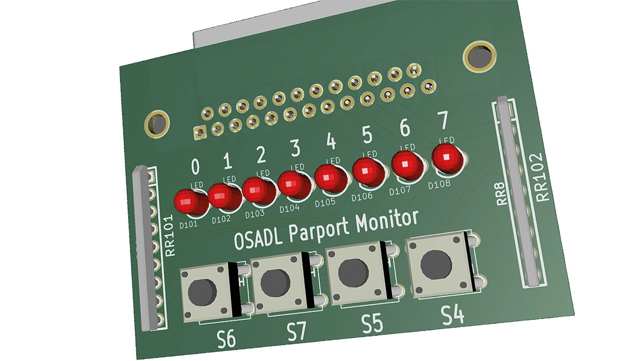 In diesem Fall könnte es hilfreich sein, wenn der Computer über eine parallele IEEE-1284-Druckerschnittstelle verfügt (oder über ähnliche GPIO-Leitungen), denn diese können verwendet werden, um Controller-Register durch direkten Speicherzugriff zu lesen oder zu schreiben, ohne dass Interrupt-Bearbeitung erforderlich ist. Dies ist wichtig, da das Interrupt-System im Falle eines Absturzes möglicherweise nicht mehr funktioniert. Obwohl diese heute nicht mehr zum Anschluss eines Druckers verwendet werden, sind Parallelport-Adapter für den PCI-, PCIe- und Mini-PCIe-Bus immer noch weit verbreitet und werden von Linux unterstützt. OSADL stellt ebenfalls im Rahmen der Add-on-Patches einen kleinen Kernel-Treiber bereit [2] und liefert dafür einen Adapter mit acht Leuchtdioden und vier Drucktastern (siehe Bild).