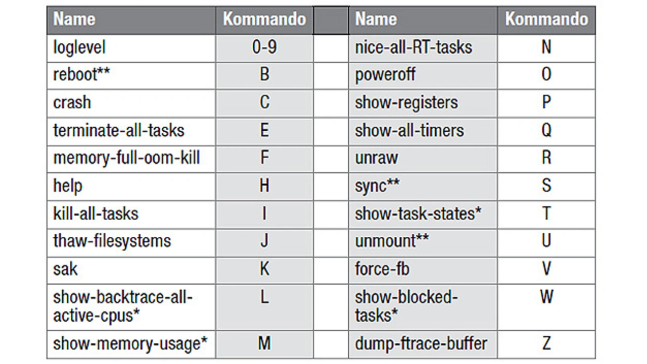 in die Logdatei. Die Trigger-Variable /proc/sysrq-trigger ist allerdings im Falle eines Computerabsturzes normalerweise nicht verwendbar, weil ein Log-in mit Shell-Kommandozeile nicht mehr funktionsfähig ist. Die Systemabfrage über das Keyboard ist dagegen häufig noch möglich, sodass sich zum Beispiel ein gezielter Reboot des Systems mit der Kommando-Sequenz S/U/B auslösen lässt. Durch die Sync- und Unmount-Kommandos vor dem Reboot wird mit hoher Wahrscheinlichkeit verhindert, dass beim Reboot ein Filesystem-Check ausgeführt wird. Für diese Kommando-Sequenz müssen nacheinander die Tasten