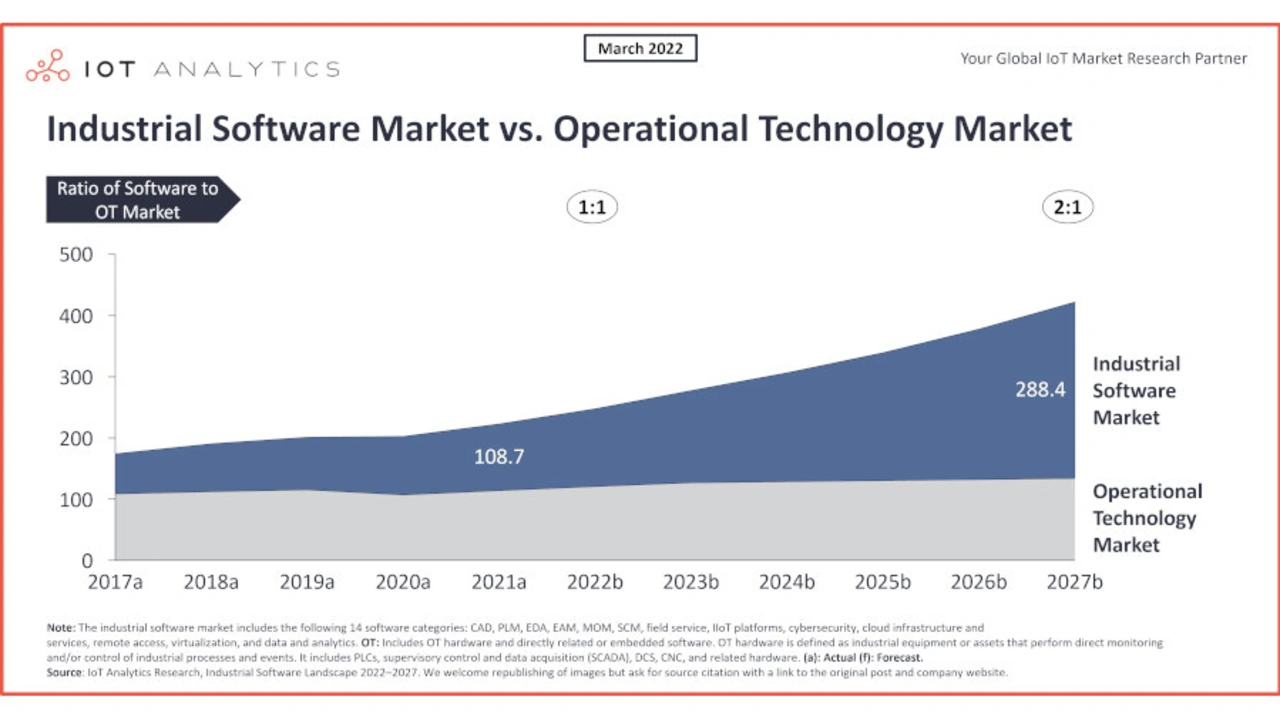Noch vor fünf Jahren, im Jahr 2017, war der Markt für industrielle Software etwa 40 Prozent kleiner als der Markt für Automatisierungstechnik. Zehn Jahre nachdem Marc Andreessen, Mitgründer von Netscape Communications, im Jahr 2011 verkündete, dass »Software die Welt auffrisst«, wird die Fertigung immer softwarebasierter. IoT Analytics schätzt, dass der Markt für industrielle Software in fünf Jahren doppelt so groß sein wird wie der Markt für Automatisierungstechnik. Der Gesamtmarkt, 2021 mit einem Volumen von 109 Mrd. US-Dollar, soll 2027 auf 288 Mrd. US-Dollar wachsen.