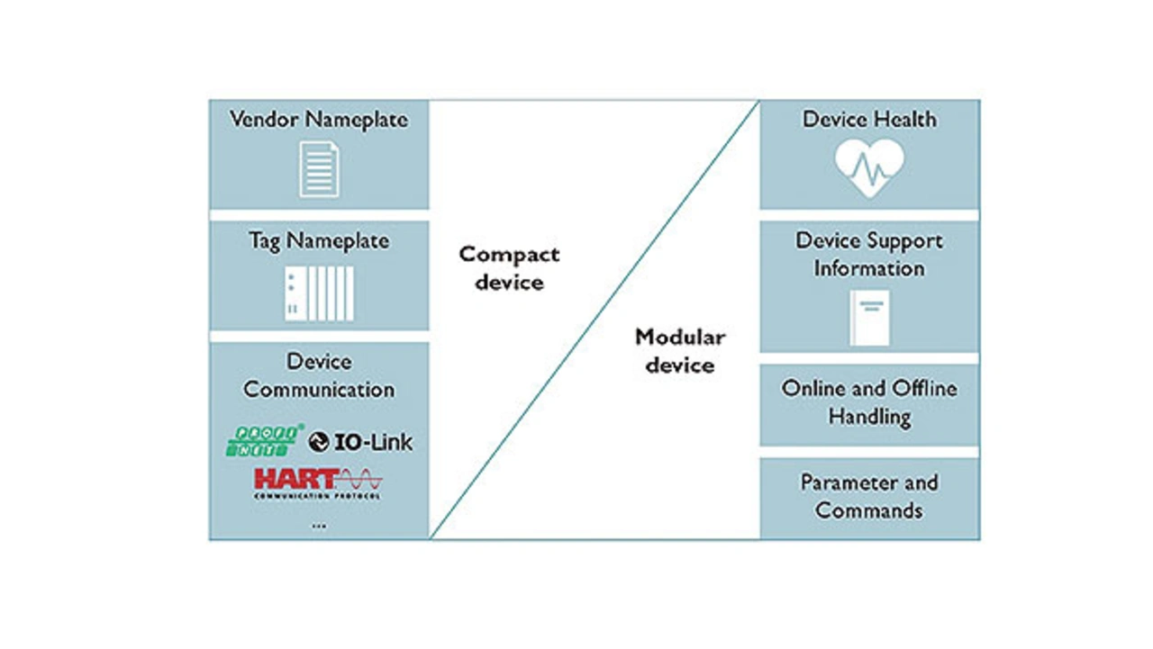 Im ersten Schritt beschäftigte sich die DI-Arbeitsgruppe mit dem Adressieren der Geräte sowie einem Konzept zum Modellieren von unterschiedlichen parallelen Funktionen auf einem Gerät. Statt eines »Device Types« wurde ein »Component Type« definiert, der sich mit einem Interface vom Typ »BaseInterfaceType« ausbauen lässt. Als Beispiel für ein Interface in der Spezifikation seien die Informationen zum Gerätehersteller oder -namen angeführt.