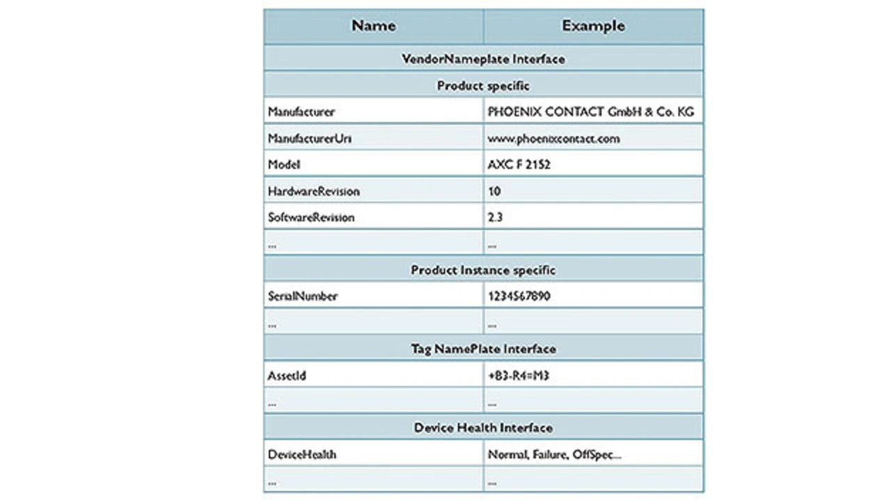 Die Daten wurden in vier verschiedenen Interfaces zusammengefasst: herstellerbezogene Informationen, anwenderspezifische Informationen, Statusinformationen und erweiterte Support-Dokumentation. Das Interface zum »VendorNameplate« enthält sämtliche klassische Informationen, die der Hersteller seinem Gerät mitgibt. Mit dem Interface »TagNameplate« lassen sich anlagenbezogene Gerätenamen als String ablegen. Ähnlich einer Sammelfehlermeldung gibt das Interface »DeviceHealth« aus, ob das Gerät fehlerfrei arbeitet oder eine bestimmte Fehler klasse meldet (Bild 2).