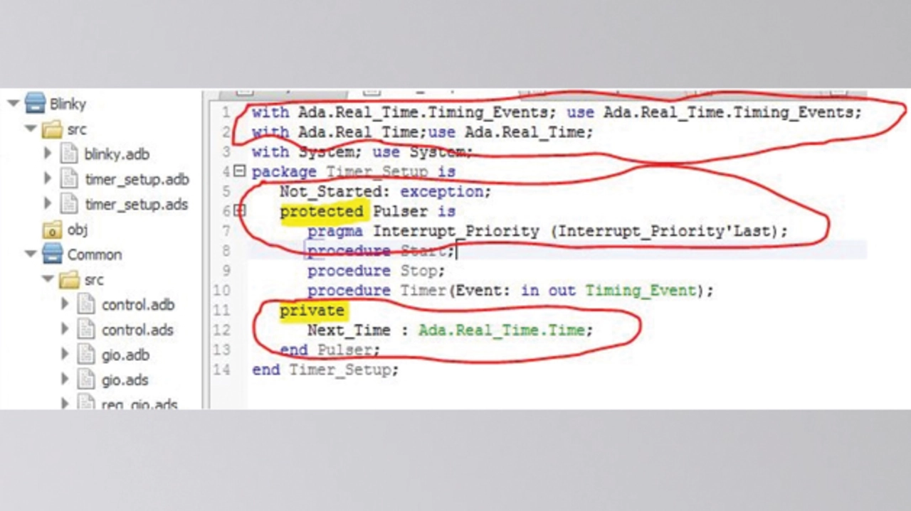 In Bild 5 ist die Spezifikation des Package »Timer_Setup« dargestellt. Hier wird das Child-Package »Ada.Real_Time.Timing_Events« benutzt (Zeile 1), das es seit Ada 2005 gibt. Besondere Aufmerksamkeit gilt dem sogenannten »protected object«, eine Eigenschaft, die kongruente Programmierung in Ada erleichtert. Auf die privaten Elemente eines »protected objects« kann man nur von einem Task zu einer bestimmten Zeit zugreifen. Das vereinfacht die in anderen Sprachen oft nicht-triviale Implementierung von Mutexes. Das »pragma Interrupt_Priority« in Zeile 7 ist nötig, um die Priorität des Timer-Interrupts auf den höchsten Wert zu setzen.