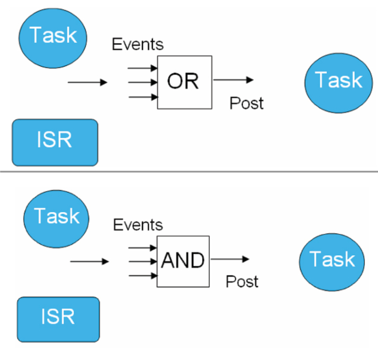 Die oben beschriebenen Funktionen eines Echtzeitbetriebssystems eignen sich, um zu signalisieren, dass ein einzelnes Ereignis aufgetreten ist. Manchmal ist auch eine Signalisierung sinnvoll, wenn mehrere Ereignisse aufgetreten sind. Für solche Situationen kommen Ereignis-Flags zum Einsatz. Ereignis-Flags nutzt man in der Regel in einer Oder-Verknüpfung (disjunktive Synchronisation, Bild 4 oben), wobei ein beliebiges ausgesendetes Ereignis-Flag den zu signalisierenden Task auslöst. Eine Und-Verknüpfung (konjunktive Synchronisation, Bild 4 unten) lässt sich ebenfalls nutzen, wenn alle Ereignis-Flags in einer Gruppe ausgelöst werden müssen, bevor ein Task signalisiert wird.