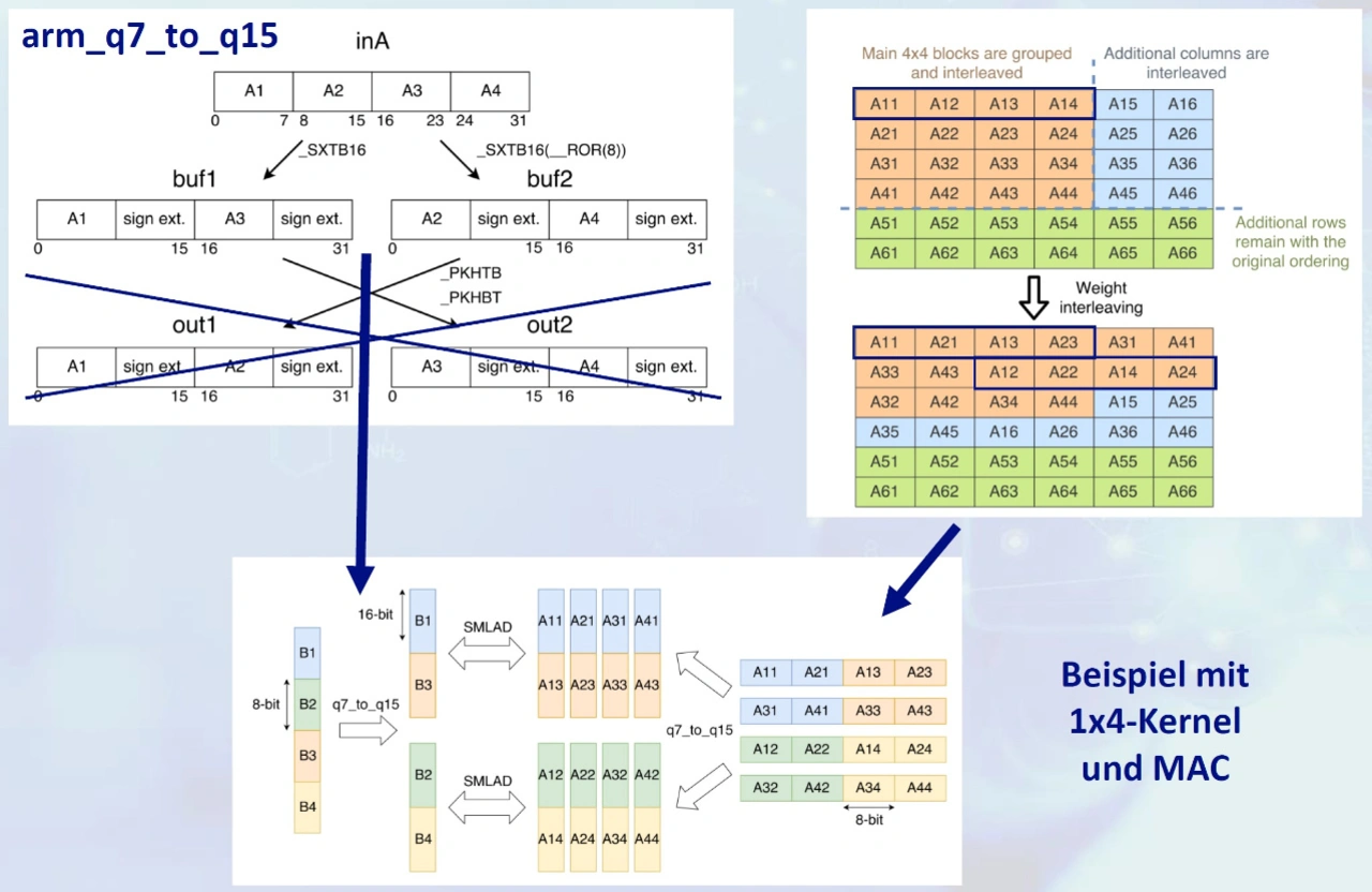 Unter der Prämisse, die Leistung seitens des Befehlssatzes und der Register einer Halbleiter-Recheneinheit möglichst auszunutzen, optimiert ein Entwickler architekturspezifisch noch umfangreicher. Als Beispiel hierfür dient das »Weight Interleaving«, welches ebenso bereits im Offline Tooling mit den Gewichten der KNNs ausführbar ist. Hierbei muss man etwas ausholen: Für die Inferenzen der KNNs in Funktion sind Matrixmultiplikationen für das Berechnen von Input-Signalen mit den Gewichten der jeweiligen Neuronen nötig. Sie können wiederum aus vielen unabhängigen Multiply Accumulate(MAC)-Operationen bestehen. Es dreht sich grundsätzlich oft