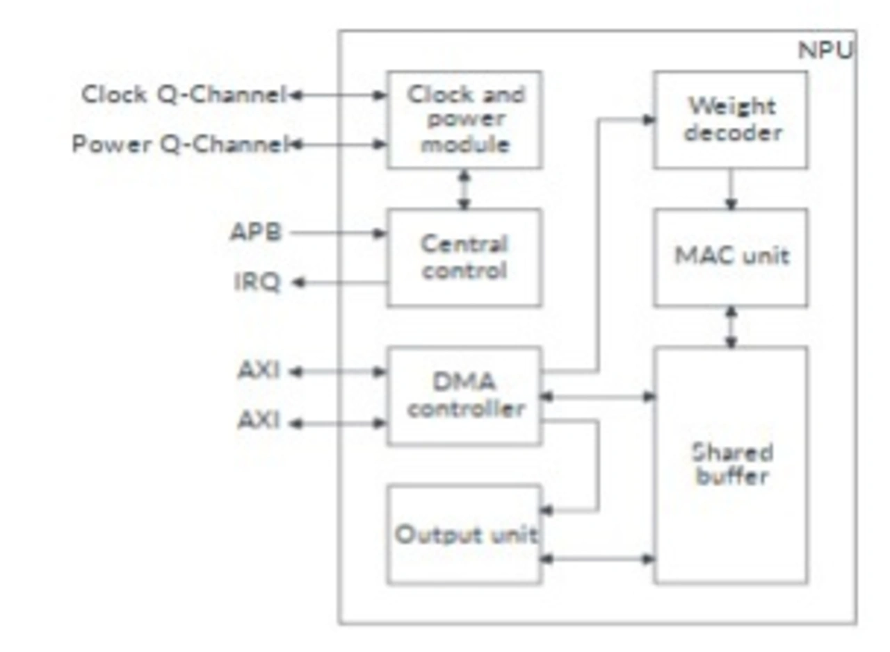 Die Halbleiterhersteller und IP-Lieferanten selbst haben ebenfalls proprietäre Beschleuniger im Angebot. Dennoch ist der U55 ein gutes Beispiel für einen tiefen Einblick: Eine Neural Processing Unit (NPU) zeichnet sich innerhalb der Gesamtarchitektur über ihre Eigenständigkeit mit gleichzeitig sehr umfangreichem und speichernahem Zugriff aus. Hierbei ist das Ziel der Einheit, das schnelle Verarbeiten spezifischer Funktionen, also meist MAC-Operationen. Sie haben oft eine andere Taktrate sowie eine verkürzte Verarbeitungs-Pipeline.