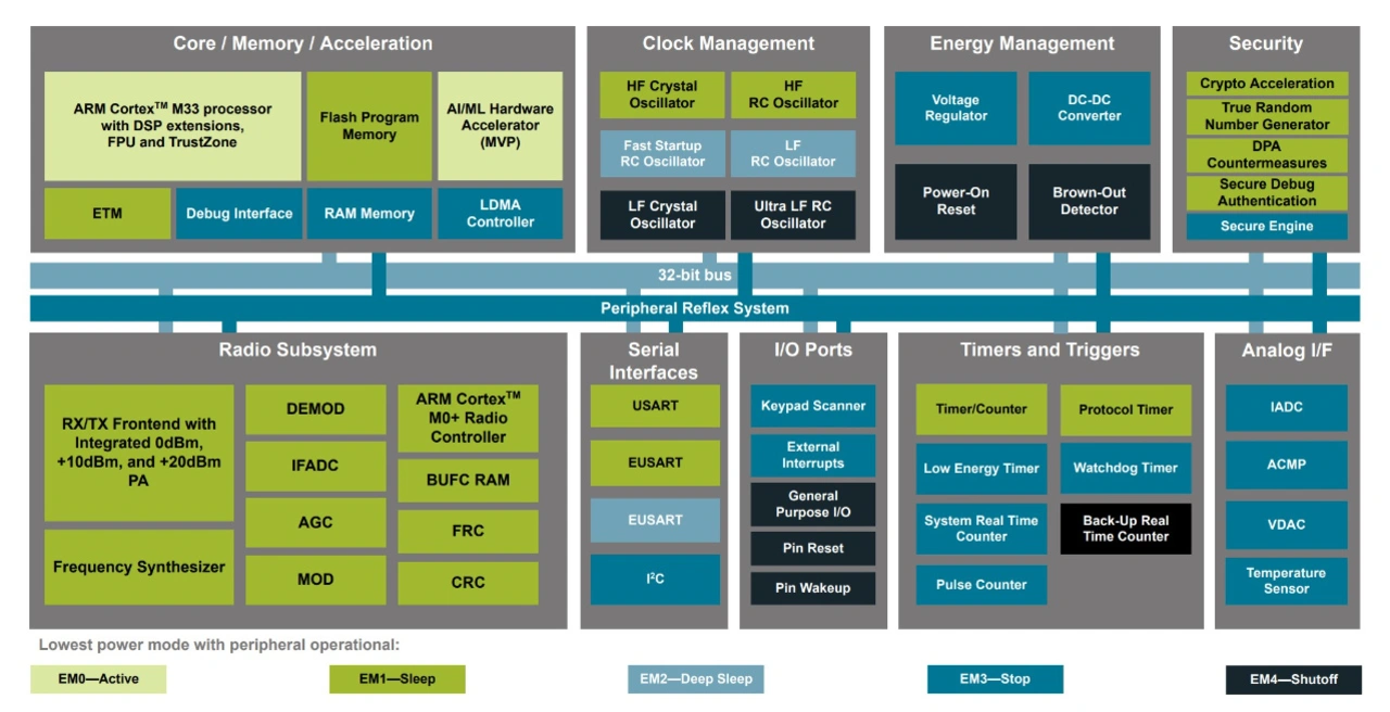 Beispielsweise war die »MAX78000«-Serie von Analog Devices mit Heterogenous Multicore Processing (HMP) mitsamt einem RISC-V-Kern und einem ML-Beschleuniger sehr erfolgreich bei Applikationen für das Erkennen von Sprache. Wobei sein Nachfolger, der »MAX78002« in den Videobereich hineinragt – nicht zuletzt aufgrund 2048 x 2048-Bild-Inputfähigkeit und 2 MB internem NPU-Speicher (Bild 6). Ebenso bemerkenswert ist beispielsweise Silicon Labs mit den »MG24/BG24«-SoCs mit einem eigenen ML-Beschleuniger. Er ist auf Low-Power- und Wireless-Applikationen spezialisiert (Bild 7). Man beachte der Vollständigkeit halber ebenfalls die Sensoren, die immer mehr ML-(Vor)-Verarbeitung übernehmen. Ein gutes Beispiel ist der »LSM6DSO32X« als ein performanter Vertreter der »iNemo«-Sensorserie von STMicroelectronics. Er kann mit seiner Multi-Level-Cell(MLC)-Unit unter anderem einen Entscheidungsbaum mit bis zu 256 Knoten abbilden.