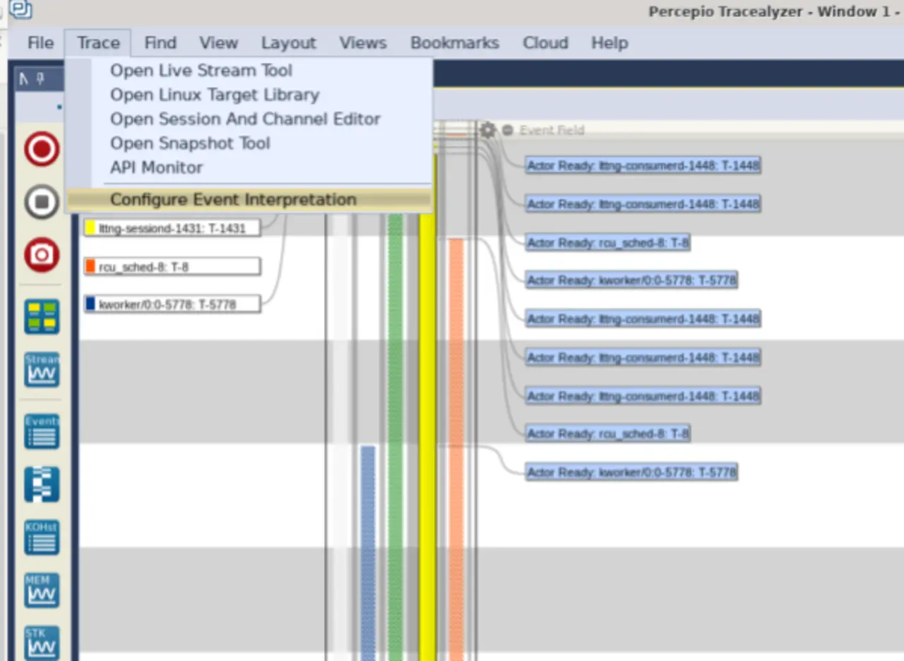 Wurde ein Datensatz generiert, wird er im nächsten Schritt in Tracealyzer für Linux geöffnet. Nach dem Öffnen des Trace ist Tracealyzer als erstes anzuweisen, wie die Userspace-Ereignisse zu parsen und zu visualisieren sind. Zu dem Zweck wählt man in der oberen Leiste den Menüpunkt »Trace« und klickt anschließend auf »Configure Event Interpretation« (Bild 1).