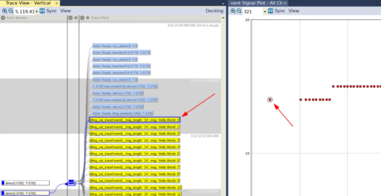 Im User Event Signal Plot scheint es lediglich zwei Datenpunkte zu geben, obwohl tracef in Wirklichkeit 25-mal aufgerufen wurde. Erhöht man den Zoomfaktor, erkennt man jedoch mehrere Punkte, bei noch näherem Heranzoomen werden alle 25 Aufrufe der tracef-Funktion sichtbar. Wie man sieht, erhöht sich der Wert (Y-Achse) nach zehn Aufrufen, da dann die String-Länge um ein Zeichen wächst. Klickt man einen Punkt an (rechts im folgenden Bild), markiert Tracealyzer außerdem den zugehörigen Aufruf in der linken Trace-Ansicht (Bild 3).