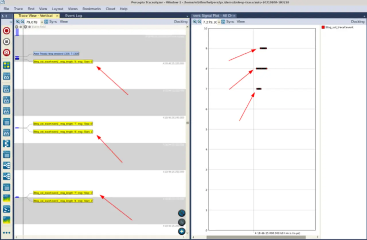 Interessant an den obigen Befehlen ist, dass ebenfalls Kernel-Traces erfasst werden. Das geschieht aus zwei Gründen: Erstens lässt sich mit der Hinzunahme von Kernel-Tracedaten oftmals der zeitliche Ablauf der Userspace-Ereignisse verdeutlichen. Wenn zum Beispiel eine lange Zeitspanne zwischen zwei Ereignissen in der Applikation liegt, dürfte sich mit den Kernel-Ereignissen die Ursache dafür ermitteln lassen. Zweitens benötigt Tracealyzer in der Version 4.4.4 noch einige Daten aus dem Kernel-Trace, um UST-Ereignisse korrekt darstellen zu können (auch wenn nicht unbedingt der komplette Kernel-Trace erforderlich ist). Das Percepio-Team ist sich der Problematik bewusst und arbeitet an einer Lösung für ein künftiges Release.