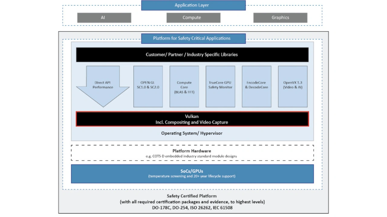 Den neuen Grafik- und Rechentreiber VkCore SC für sicherheitskritische Anwendungen hat CoreAVI von Grund auf für eine hohe Leistung und Flexibilität entwickelt. Er wurde auf die neue Vulkan SC API der Khronos Group abgestimmt und bietet die Möglichkeit einer Zertifizierung nach ISO 26262 ASIL D, RTCA DO-178C/EUROCAE ED-12C bis hin zu DAL A und IEC 61508 SIL3. Der Treiber unterstützt mehrere GPU-Architekturen, sodass der Entwickler seinen sicherheitskritischen Software-Stack nahtlos über verschiedene Implementierungen hinweg migrieren kann. Dies erhöht die Flexibilität und Skalierbarkeit deutlich und reduziert die Gesamtbetriebskosten für Sicherheitssysteme. VkCore SC bildet die Grundlage der CoreAVI-Plattformen für sicherheitskritische Anwendungen und erfüllt die Anforderungen von allen sicheren Grafik- und Rechenanwendungen aller vertikalen Märkte.