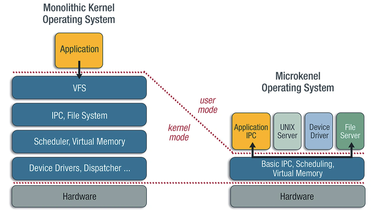 Eine Verringerung der Menge an kritischem Code kann auch dadurch erreicht werden, dass der potenziell gefährliche Code an einer Stelle untergebracht wird, an der eine Fehlfunktion unkritisch ist. Auf einem Betriebssystem mit monolithischem Kernel laufen beispielsweise die meisten Treiber und Protokollstapel, wie TCP/IP, im Supervisor-Modus der CPU (Bild 1 links). Im Falle eines Fehlers im Code des Treibers oder des Stacks kann das gesamte System betroffen sein und zusammenbrechen. Wenn dieser Code jedoch im Benutzermodus der CPU läuft, wie es in einem Mikrokernel-basierten Betriebssystem der Fall ist (Bild 1 rechts), ist ein Fehler in einer dieser Softwarekomponenten viel weniger kritisch, da nur der betroffene Prozess abstürzen kann und nicht der zugrunde liegende Kernel oder andere Prozesse.