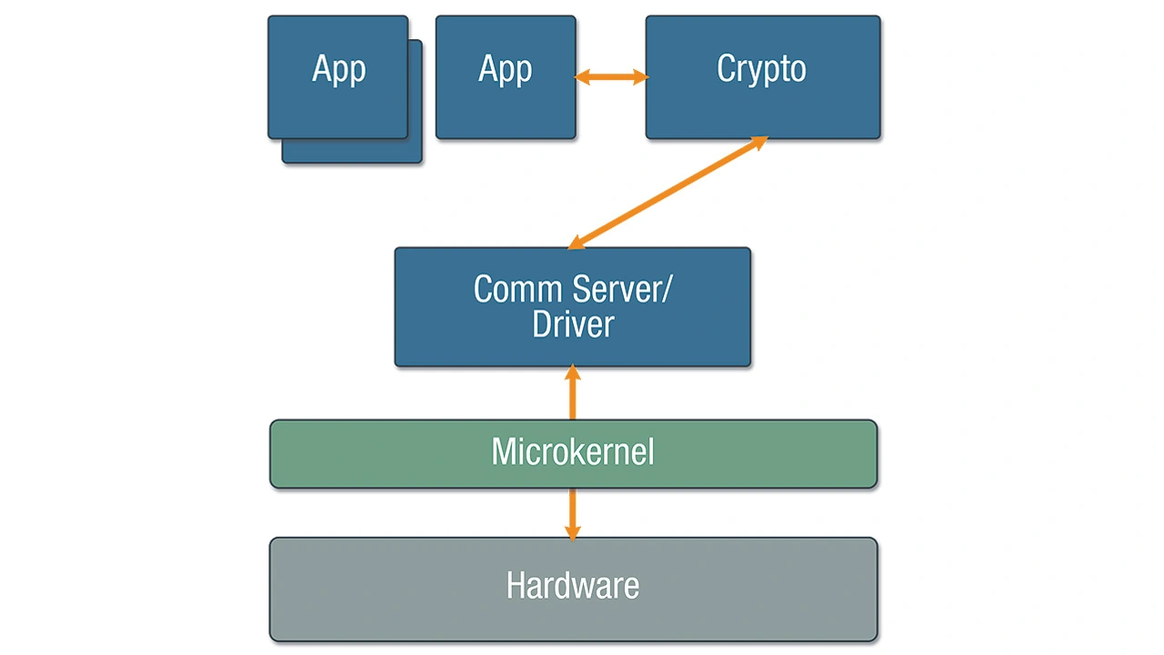 Sicherheitsrelevante Komponenten müssen vom Rest des Systems getrennt werden und ihre Schnittstellen müssen klar definiert und über- prüfbar sein. Die Vorteile dieses Ansat- zes sind Testbarkeit, Auditierbarkeit, Datenisolierung und gegebenenfalls Schadensbegrenzung. Bei einer sicheren Netzwerktransaktion sorgt diese Architektur dafür, dass der Kommunikations-Stack und der Treibercode nur verschlüsselte Daten sehen (Bild 2). Selbst wenn sie gehackt werden, erhalten sie also niemals Zugriff auf die ursprünglichen Klardaten, und die Daten können nicht von Hackern gestohlen oder verändert werden.