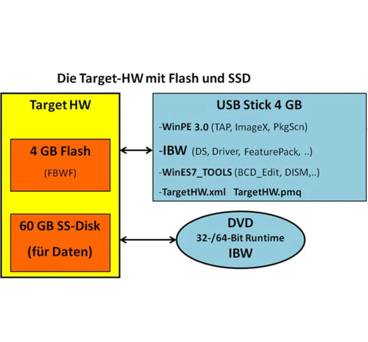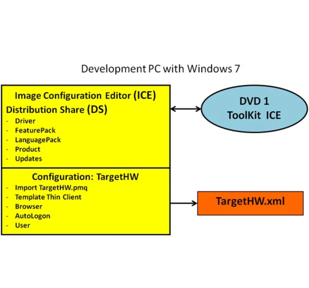 Durch Ausführung des ICE-Setup-Programms (DVD 1) wird das komplette Toolkit auf dem Entwicklung-PC installiert. Der Distribution Share (DS) enthält den kompletten, modulbasierten Baukasten von Windows 7 Ultimate mit allen Treibern und Feature Packs. Eine neue Konfiguration wird in der Ergebnisdatei TargetHW.xml abgelegt. Mit diesem Tool lassen sich Kundenwünsche wie User Name, Password, AutoLogon, Browser, Customer-Shell usw. einstellen.