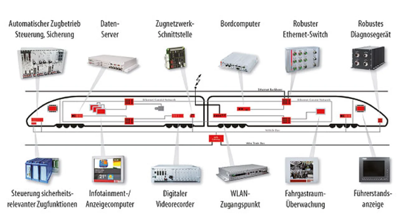 Ein weiterer wichtiger Faktor ist das Alter eines Zugs. Neue Fahrzeuge lassen sich von vornherein optimal konzipieren (Bild 1). An und in einem Zug wird über dessen Lebensdauer aber viel geschraubt, repariert und modernisiert. Nur so ist schließlich ein wirtschaftlicher Betrieb möglich. Der komplette Austausch wäre zu teuer. Nachgerüstete Komponenten sind deshalb in gewisser Weise immer Flickwerk, müssen aber oft kompatibel zu Bestehendem sein. Abgesehen von Einsatzbereich und Alter geht es aber auch um die Funktionen der Rechnersysteme. Nicht nur sichtbare Dinge wie Anzeigemonitore oder drahtlose Verbindungen für den Internet-Zugang der Fahrgäste, sondern auch wirklich kritische Aufgaben wie Türsteuerung, Licht oder auch die Gesamtsteuerung von fahrerlosen Zügen erfordern entsprechend angepasste Systeme – je nachdem, wo die Elektronik sitzt und was daran angeschlossen wird.