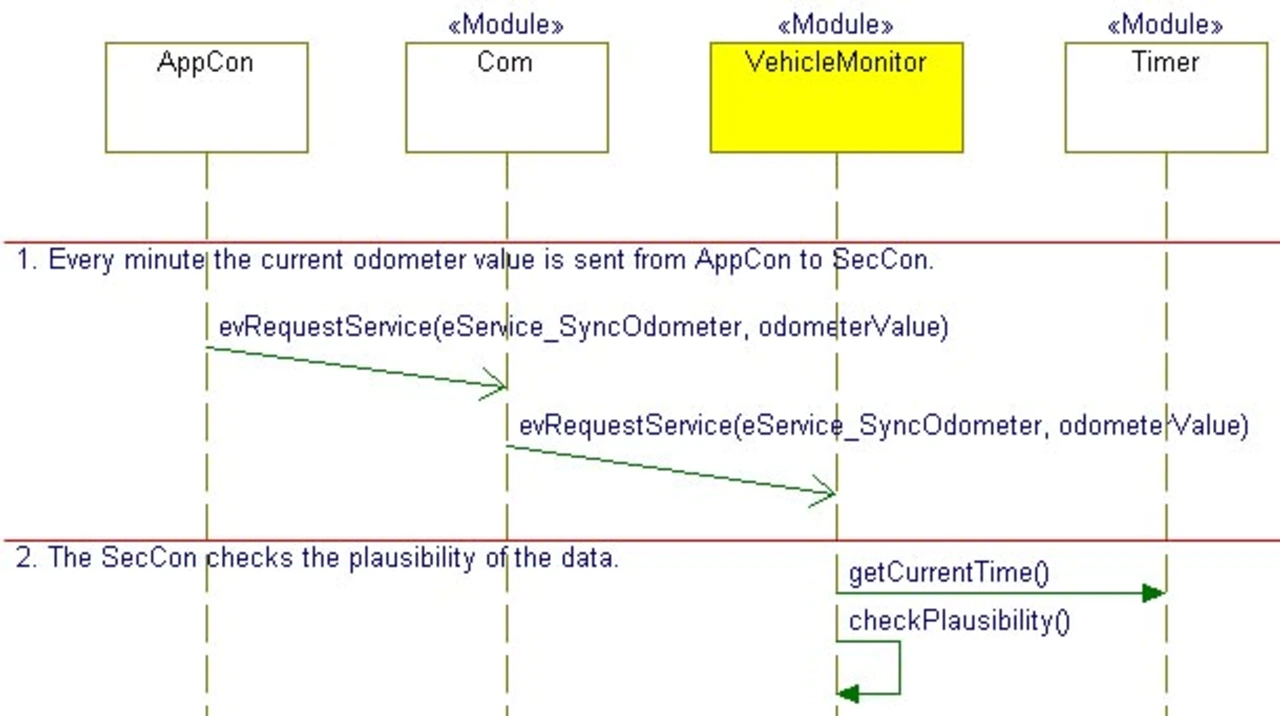 Im Beispiel aus Bild 2 ist AppCon ein externes System. Die Com-, Timer-, und VehicleMonitor-Module wurden für das Szenario identifiziert. Durch die benötigten Nachrichten und Befehlsaufrufe wird klar, wie die Schnittstellen auszusehen haben.
