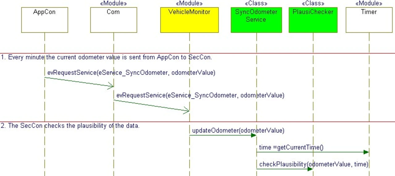 Die Ergebnisse der Architektur werden als Basis für das Design verwendet. Hierbei wird die gleiche Vorgehensweise wie bei der Architektur angewandt. Das Ganze geschieht nur eine Abstraktionsebene tiefer (Bild 3). Die Klasse VehicleMonitor ist die Schnittstelle für die anderen Module. Die grün eingefärbten Klassen (SyncOdometerService und PlausiChecker) sind Bestandteile des VehicleMonitor, die sich untereinander verwenden, aber niemals direkt von anderen Modulen verwendet werden. So entstehen die internen Elemente eines Moduls inklusive der benötigten Schnittstellen. Mit dem Wissen, wie die Schnittstelle eines Moduls aussieht, kann bereits mit den Modultests begonnen werden. Diese Tests sind auch bekannt als Blackbox-Tests.
