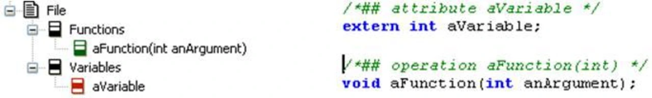 Die UML definiert zwar nicht von Hause aus unterschiedliche Ausprägungen von Klassen, jedoch hat man die Freiheit, mit Hilfe von Stereotypen unterschiedliche Implementierungen zu ermöglichen. Klassen können mehrfach instanziiert werden; so kann die gleiche Funktionalität wieder verwendet werden. Dieses Konzept wird oft nicht richtig verstanden, weil man das mit dynamischer Speicherverwendung gleichsetzt. Das ist aber nicht notwendigerweise der Fall. Mit Hilfe von Files kann man herkömmlichen C-Code abbilden (Bild 4). Files sind Container für Typ-Definitionen, Variablen und Funktionen. Somit existiert kein Unterschied zu handgeschriebenem Code.