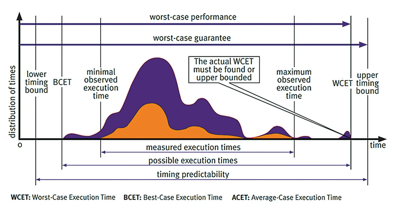 Die kürzeste Verarbeitungszeit für eine bestimmte CPU-Task wird als »Best-Case Execution Time« (BCET) bezeichnet, die längste dagegen als »Worst-Case Execution Time« (WCET). In Bild 1 ist an exemplarischen Timing-Messungen grafisch dargestellt, wie diese Werte ermittelt werden.