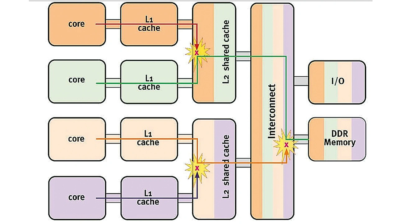 Verdeutlichen lässt sich dies an der gemeinsam genutzten hierarchischen Speicherarchitektur in Bild 2. Kollidierende Speicherzugriffe lassen im Beispiel für verschiedene Kerne unterschiedliche Interferenzkanäle entstehen, als deren Folge die Task-Verarbeitungszeit stark differiert. Hierdurch wiederum ist es in diesem System schwierig, einen vorhersagbaren Hard-Realtime-Determinismus zu garantieren.