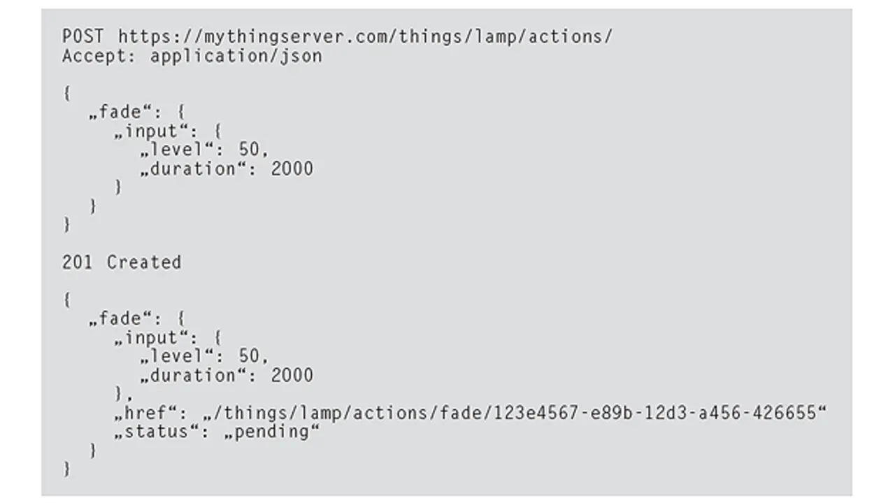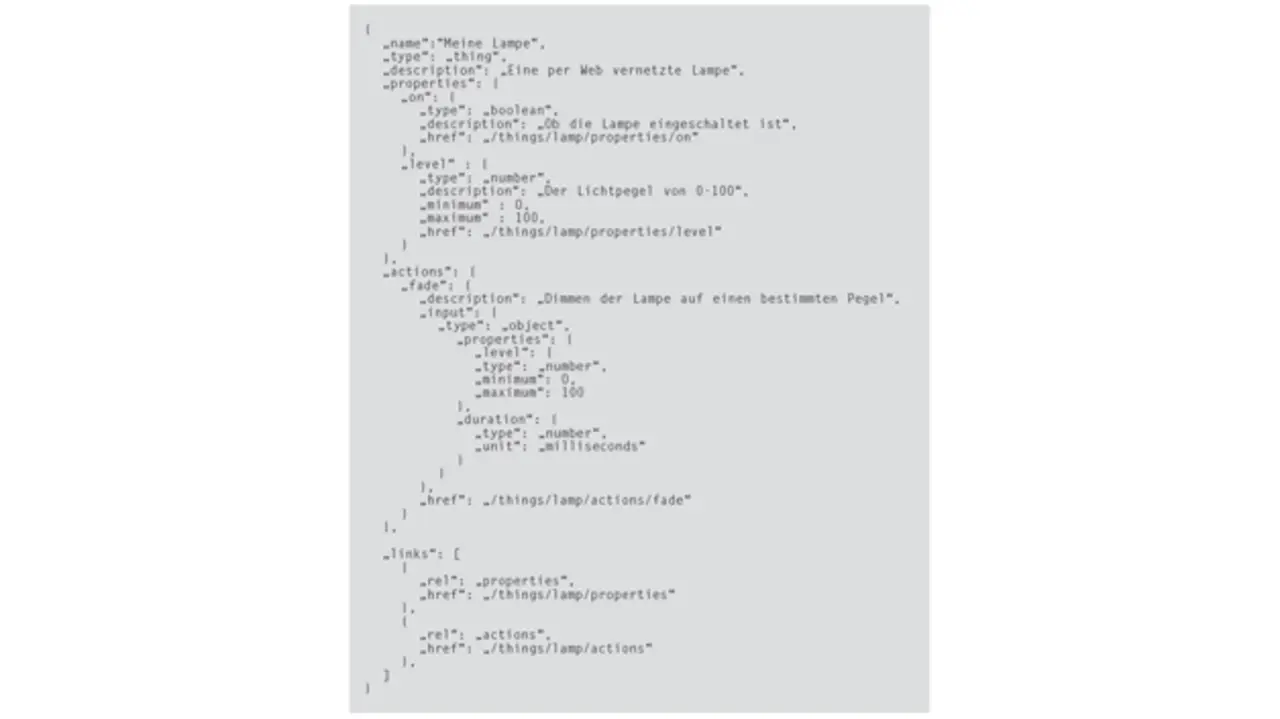Andere Einträge in der Thing Description enthalten komplexere Objekte mit Handlungen wie beispielsweise dem Dimmen einer Leuchte. Durch Zugriff auf »fade« (Dimmen) in der Thing Description kann ein Gateway oder eine anderes Gerät den Einstiegspunkt zu einer Funktion finden, die auf der Basis von Eigenschaften wie Dimmstufe und -dauer den »fade«-Vorgang ausführen kann. Folglich bietet die Thing Description ein Standardkonzept für die Identifizierung eines IoT-Gerätes und die Ausführung der verschiedenen Aufgaben, für die es konstruiert wurde.